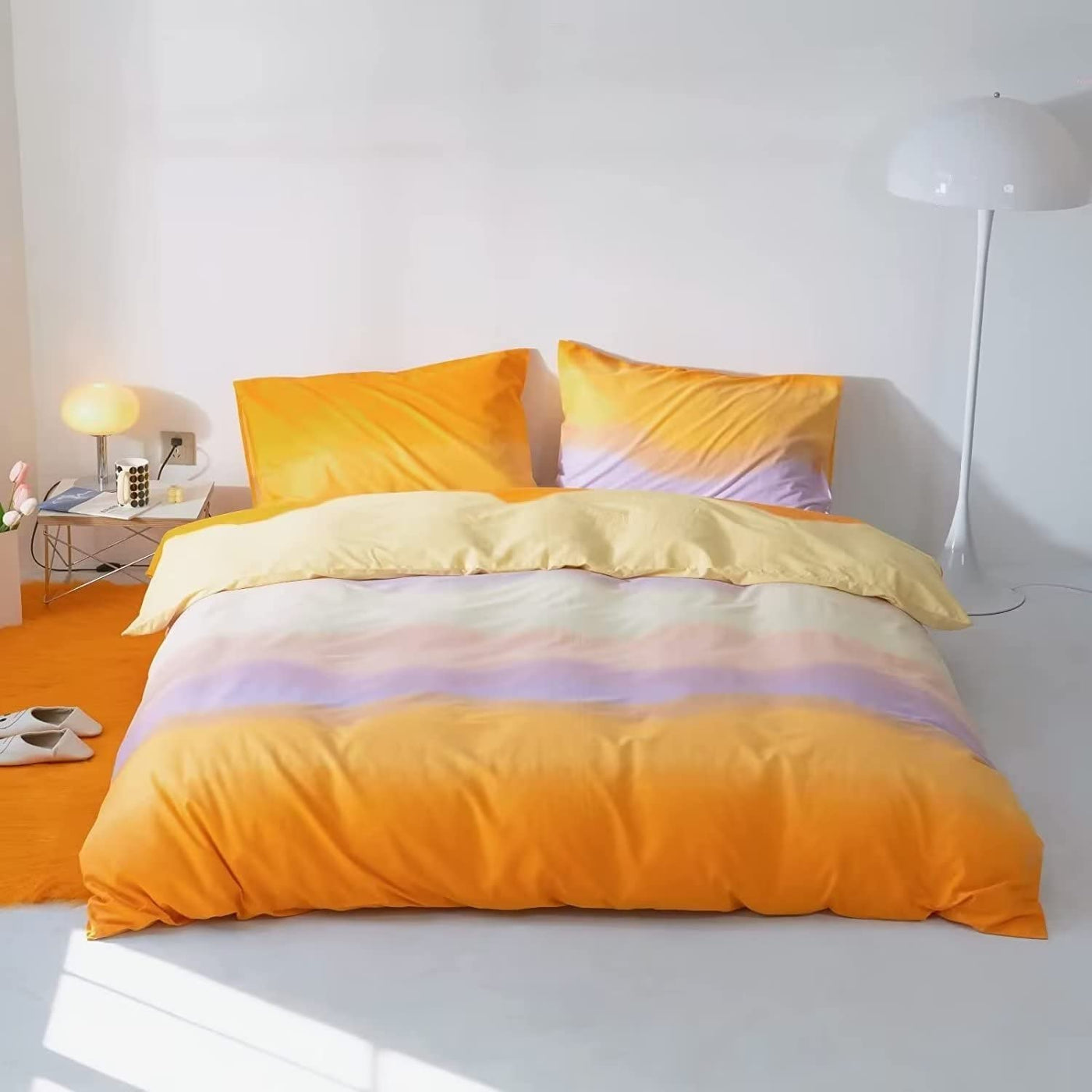 Q: What materials are used in the comforter set?A: The Houseri Rainbow Comforter Set features a soft cotton cover and is filled with 240gsm whole-piece superior microfiber. This combination offers durability, breathability, and exceptional comfort.