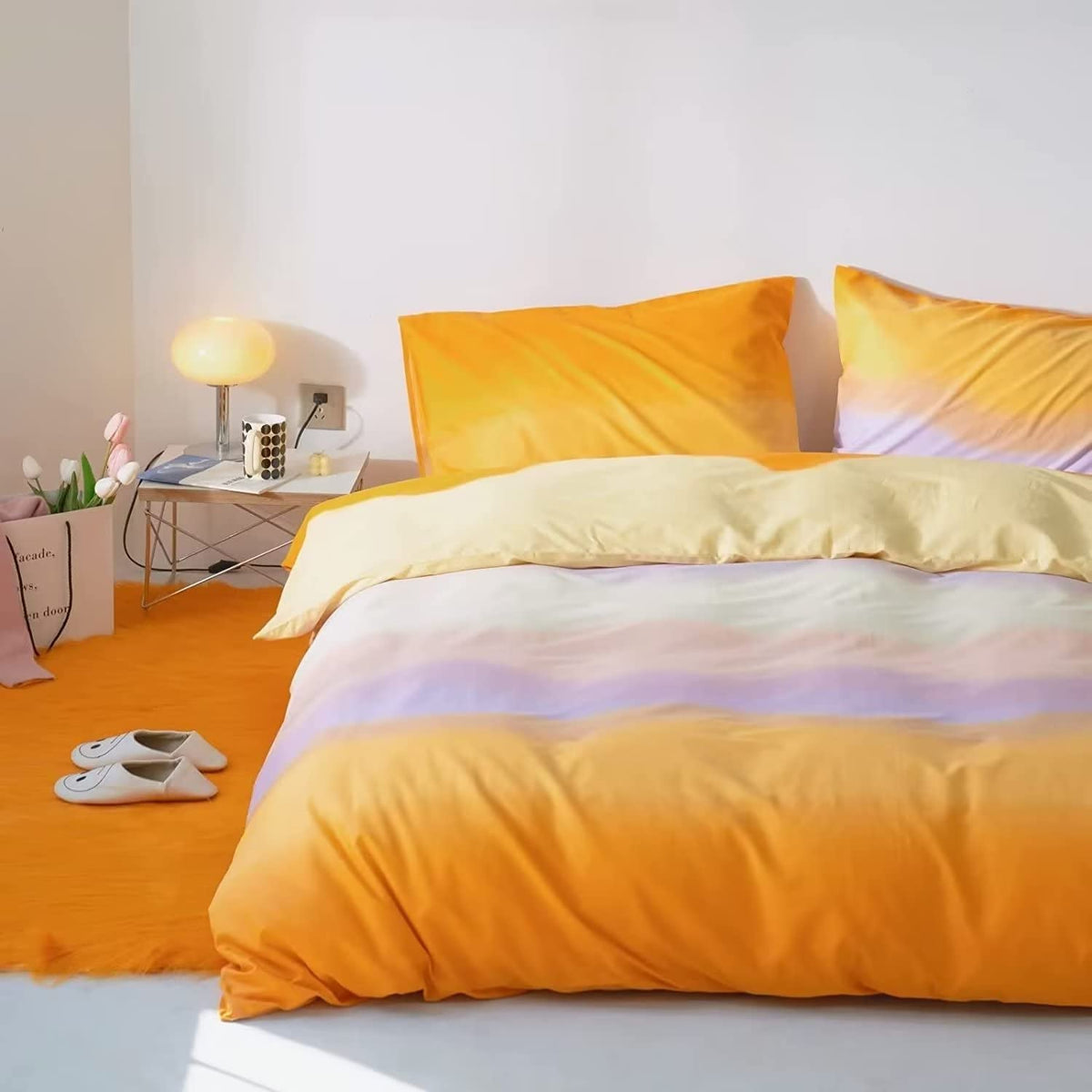 Q: How should I care for and wash the comforter set?A: To maintain the quality of the Houseri Rainbow Comforter Set, wash it separately in cold water on a gentle cycle. Avoid soaking for more than 30 minutes, do not bleach, and tumble dry on low or allow it to dry naturally. It is advised not to dry clean.