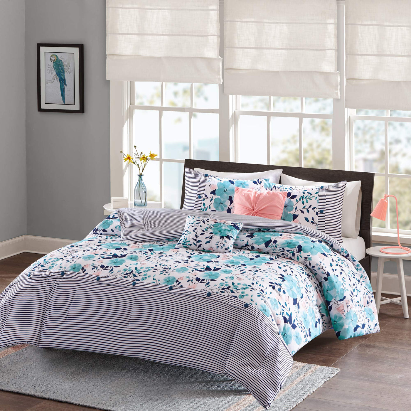 Intelligent Design Delle Comforter Set Twin/Twin Xl Size - Blue , Floral Stripes – 4 Piece Bed Sets – Ultra Soft Microfiber Teen Bedding For Girls Bedroom