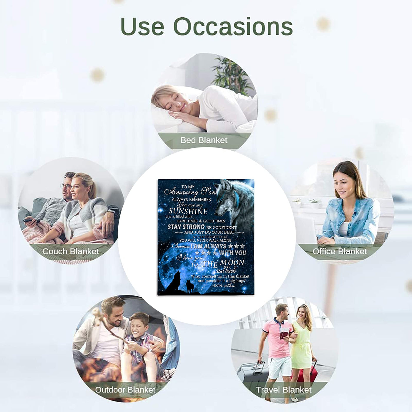 Q: What makes this blanket a unique gift for my son?A: This blanket is not only a warm and practical gift but also features heartfelt messages that express love and appreciation. It serves as a daily reminder of your affection, making it a meaningful present for any son.