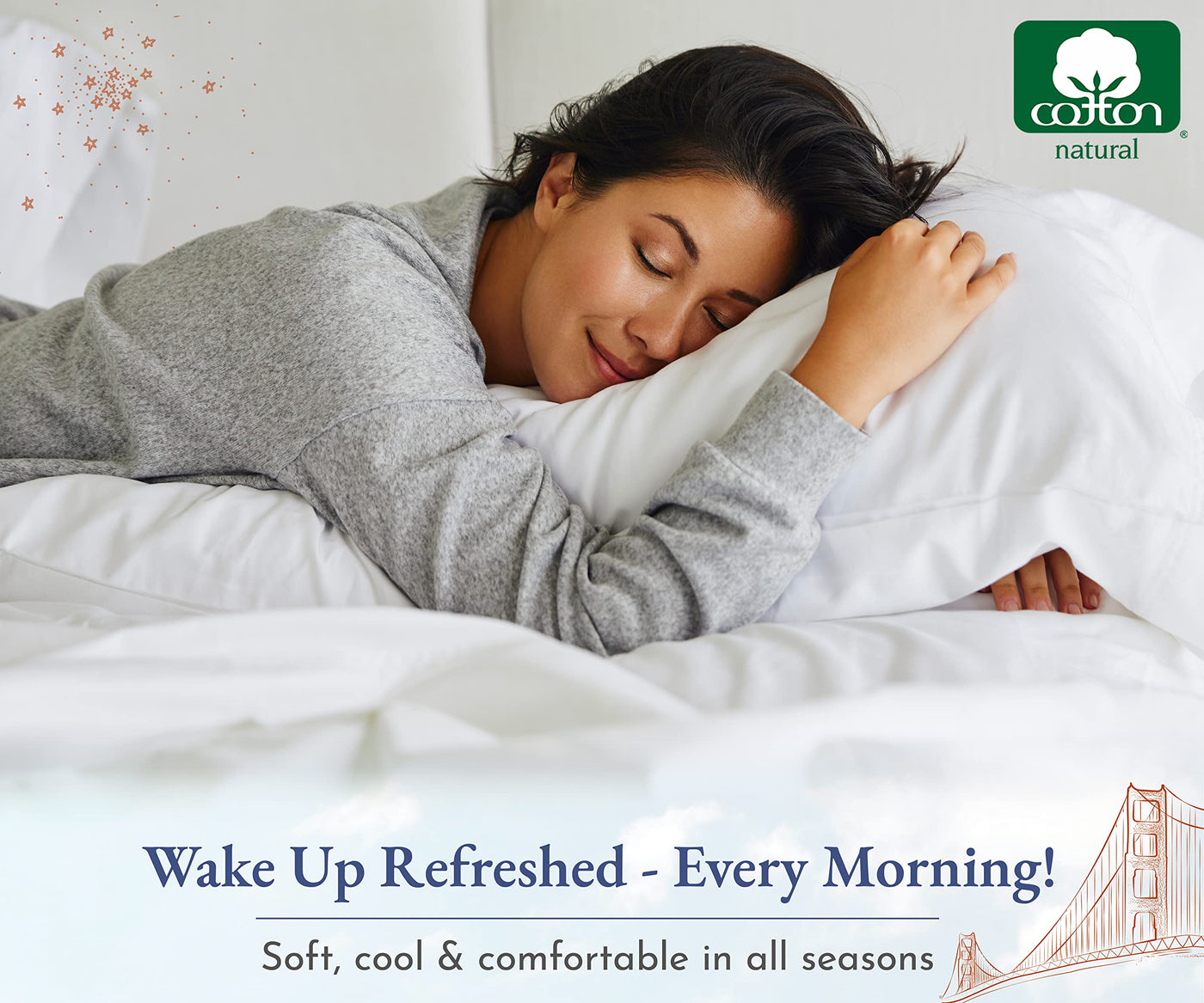 Sleep calmly with our 400 thread count pillowcases that provide incredible softness, comfort, and durability. Choice is yours: 100% Naturally-Sourced Cotton Pillowcases or Artificial Microfiber Pillowcases Ever wondered why luxury hotels use 100% cotton pillowcases while cheap motels use microfiber? Cotton pillow covers are smooth, durable and naturally easy on the skin, while microfiber gets hot and builds odor. Microfiber is made from non-biodegradable plastic fiber which causes pollution, whereas cotton is from plants - safe, pure and natural. Hence at California Design Den, we prefer pure cotton above any other fabric. Pure Cotton Smooth Pillow Cases with Lustrous Sateen Weave for Ultimate Comfort Our pillowcases are made of 400 threads per inch, and a lustrous sateen weave for durability, softness, and breathability. They are made using pure cotton yarns for the most comfortable sleeping experience. Pair our pillow covers with a flat sheet, fitted sheet, duvet protector, and coverlet to bring elegance to your bedroom. Premium Quality Pillowcases (Two Piece) With a Perfect Fit - Authentic & Tested The 400 thread count pillowcases are sold separately and offer the quality and luxury of high-grade Egyptian pillowcases. Our pillowcases are made using the highest quality dye which is color fastness, machine washable and gets softer after every wash. The fabric is tested for no pilling, shrinkage, tear strength, and thread count authenticity for durability and easy care. Exceptional Craftsmanship to Create Safe and Luxurious Bedding Expertly and ethically made, our pillowcases are stitched to perfection to provide the look and feel of Supima and silk pillowcases for luxury, style, and comfort. Our customers are happier not just comfortably enveloped in soft breathable cotton but knowing our pillowcases were made without undesirable substances and pollutive substances.