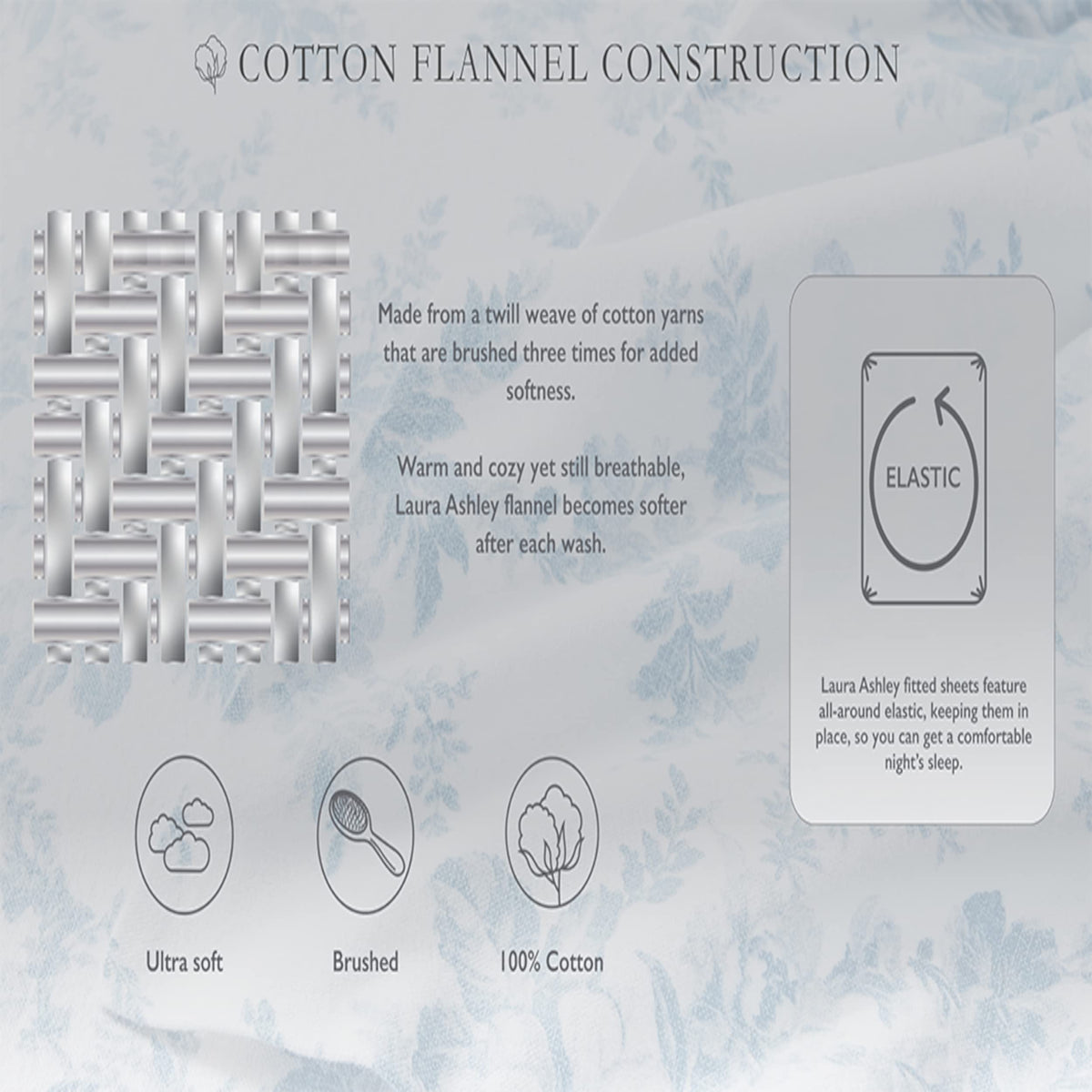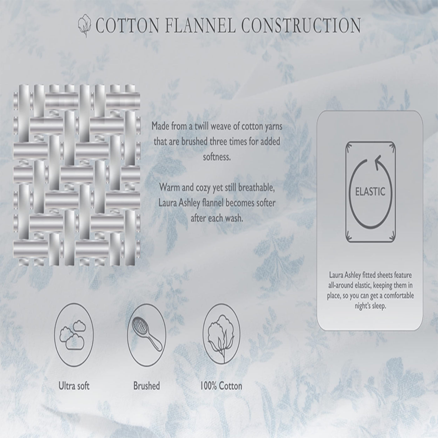 Update your bedroom décor with a new Cotton Flannel Sheet from Laura Ashley. Choose from several gorgeous and elegant designs that are sure to coordinate with your bedding ensemble. With their quality construction, these sheets offer the ultimate comfort, warmth and style. The approved process for finishing our flannel sheets is an 8-leveled brushing standard. The cotton yarns are woven, then brushed 3 times on the face and once on the back, the fabric is then colored and/or printed and finished with 3 additional brush treatments on the face and 1 on the back. This process ensures a very comfortable, soft and cozy finish that will ease you into a restful night's sleep. Set includes a fully elasticized fitted sheet that prevents slipping from your mattress and ensures a perfect fit. Sheets are machine washable for easy and convenient care.