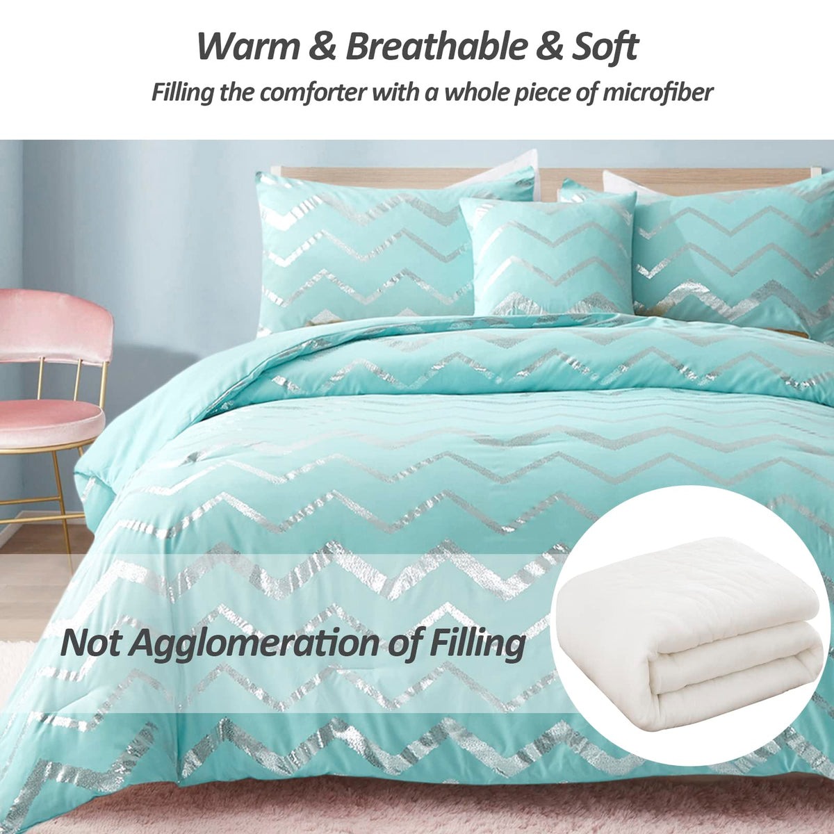 Menghomeus Aqua Comforter Set Queen Size Metallic Teal And Silver Bedding Set, 4 Piece Lightweight Microfiber Bed Set For Teen G