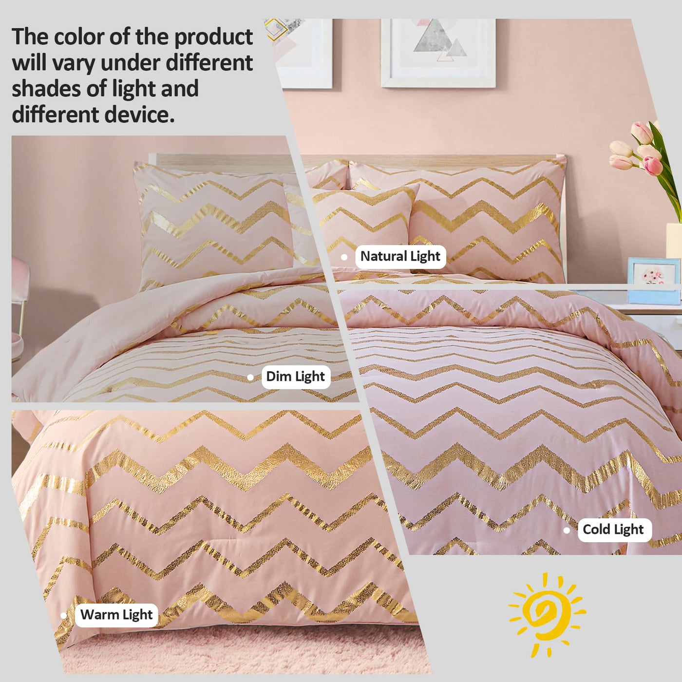 Q: What makes this comforter set ideal for teen girls and women?A: The comforter set features a cute pink color with a metallic rose gold geometric print, making it visually appealing for teen girls and women. Its glamorous design and cozy feel perfectly match a diva personality and enhance bedroom decor.