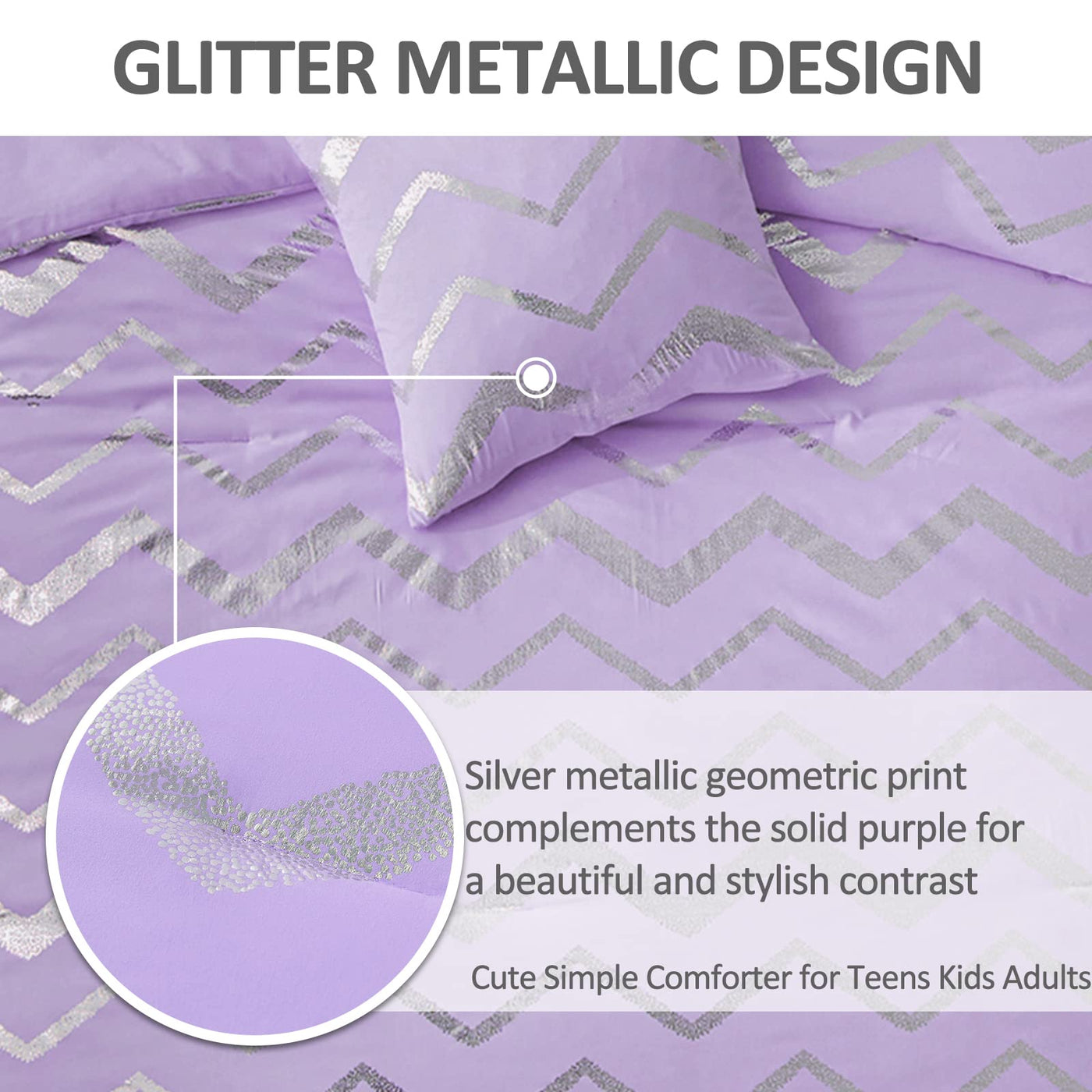 Menghomeus Purple/Silver Comforter Set Twin Lavender Metallic Print Glitter Bedding Set Cute Shinny Lilac Bed Sets For Teen Girl