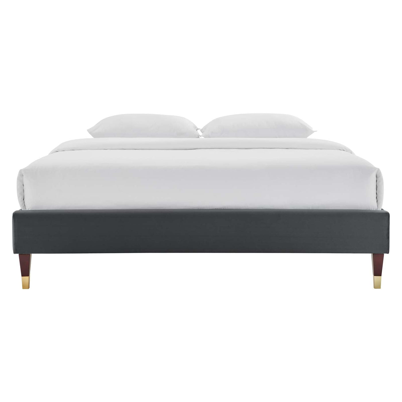- Material: Velvet, Wood - Finish: Charcoal - Wood Legs With Gold Metal Sleeves - King Platform Bed Frame - Stain-Resistant Performance Velvet - Wood Slat Support System - Reinforced Center Beam And Support Legs.