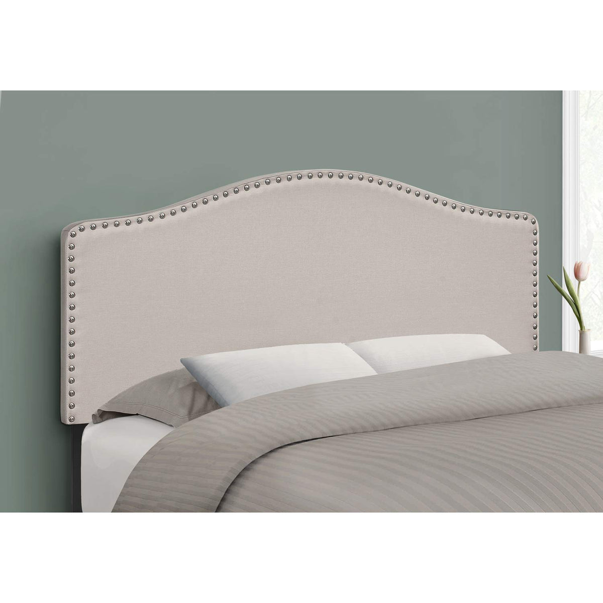 Add a finishing touch to a new bed or update the look of an existing bed with this linen-look headboard panel. Both practical and stylish, this full size upholstered headboard serves as a layer of comfort and protection between you and the wall, as well as brings a decorative element to your bedroom. Extra padding and a smooth surface covered in a beige faux linen fabric offer a supremely soft, cushioned feel whether you are sitting up or lying down in bed. Chrome-finish nailhead trim enhances the elegant silhouette of the gently arched top by creating an attractive frame that extends down the straight sides. This is an adjustable height headboard panel only (not a complete bed) and is intended for use as an add-on to your full size bed with a box spring and mattress. The sturdy wooden frame includes legs with pre-drilled holes so you can easily adjust the headboard to the best height for your bed.