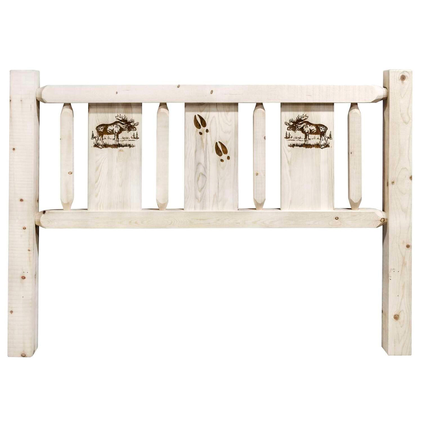 These rustic themed, laser engraved, three panel headboards feature a unique moose motif. Adding the log headboard to your existing bed is a great way to start living rustic! Handcrafted in the mountains of Montana using solid, American grown wood, the artisans rough saw all the timbers and accessory trim pieces for a look uniquely reminiscent of the timber-framed homes once found on the American frontier. All Homestead Collection headboards feature the tried and true mortise and tenon joinery system utilized for millennia by true craftsmen the world over. Comes professionally pre-finished with premium grade semi-gloss clear lacquer. The headboard comes undrilled so that you can adapt it to your particular style of bed frame or mount to the wall. Comes fully assembled. 20-year limited warranty included at no additional charge. Hand crafted in Montana U.S.A. using genuine lodge pole pine!