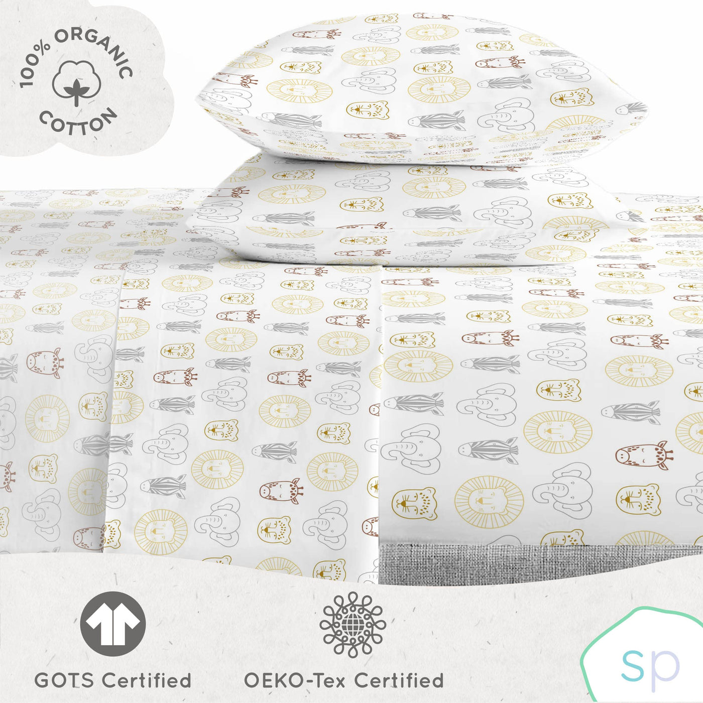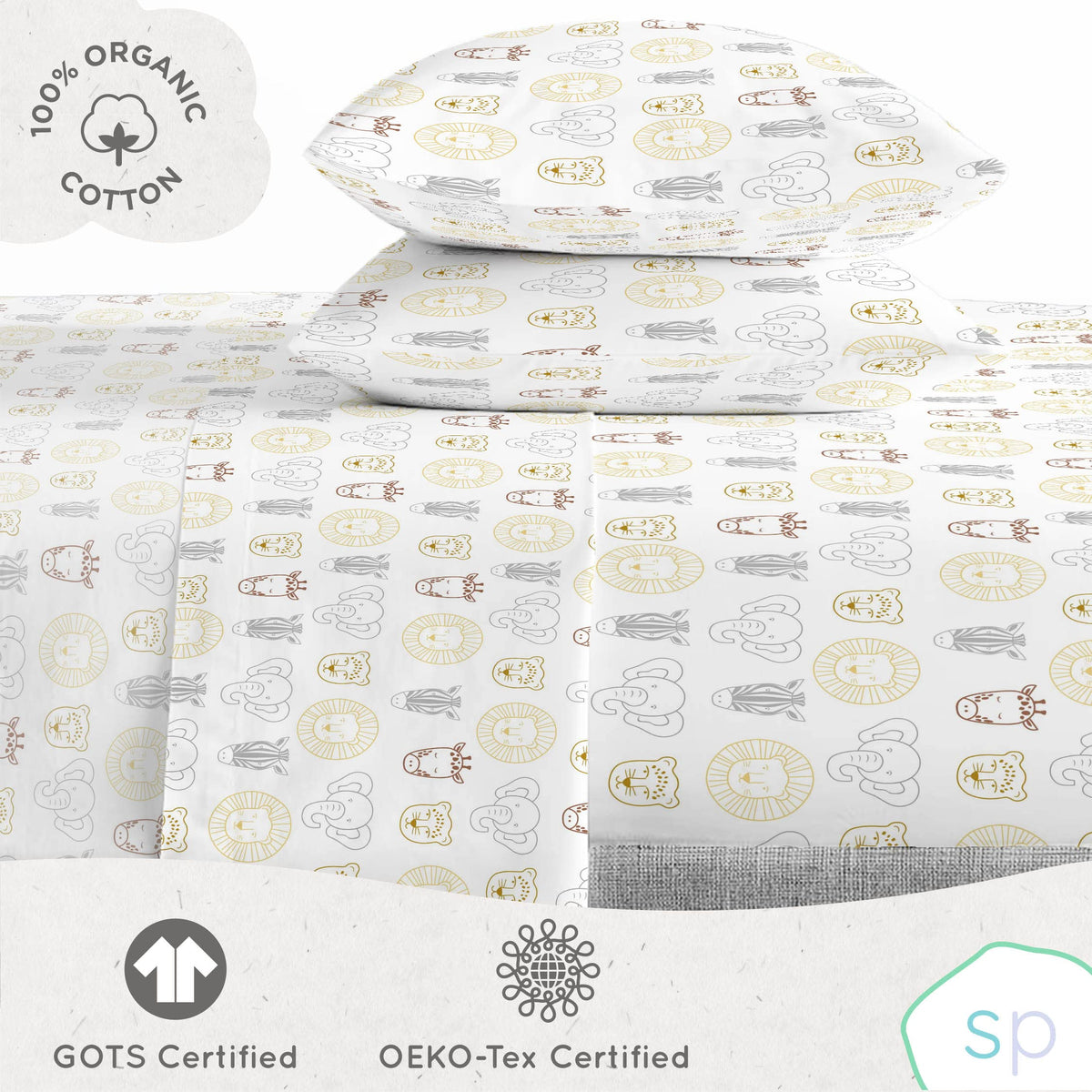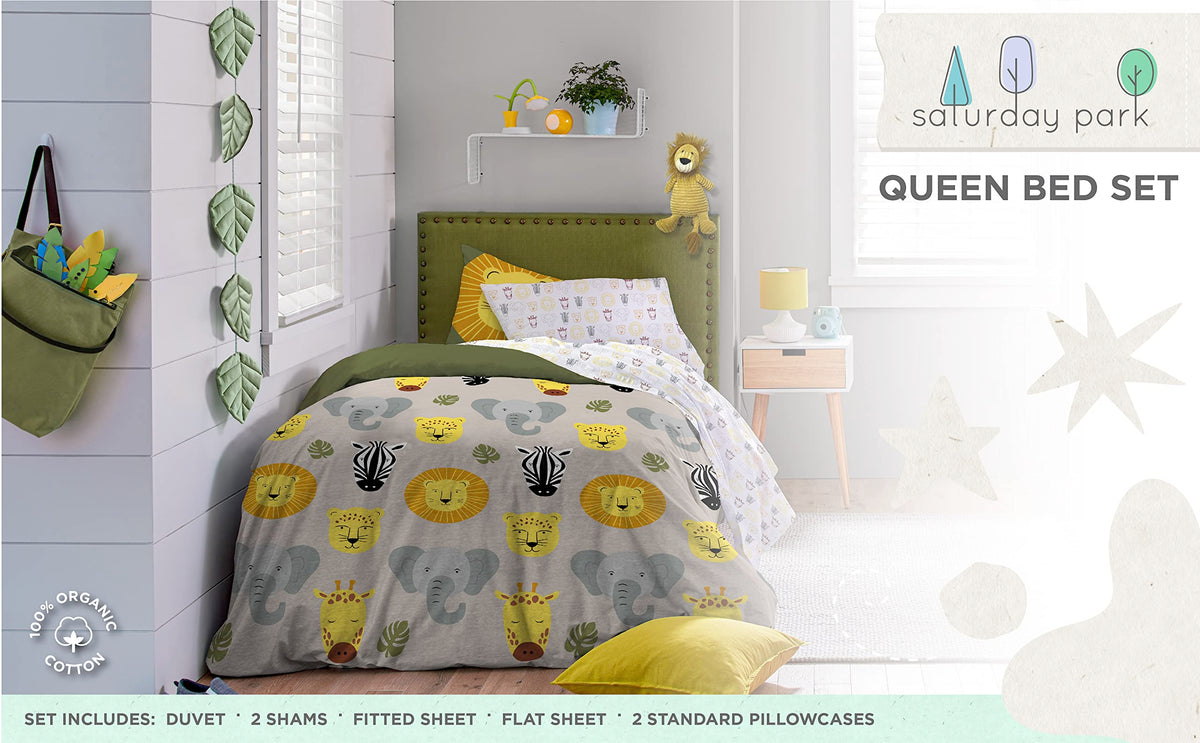 You'Ll Always Be Dreaming Of Your Favorite Animals With Our Saturday Park Safari Friends Queen Bed Set! Made Of 100% Gots Certified Organic Cotton And Oeko-Tex Certified, You Can Sleep Well Knowing Our Bed Sets Have Been Tested For Over 300 Harmful Chemicals And Synthetics. Our Bed Sets Are Composed Of Durable, Long-Staple Cotton With A Crisp Percale Weave That Gradually Softens Over Time. Saturday Park Bed Set Features Your Favorite Animals Lion, Tiger, Zebra, Elephant, And Giraffe. Seven Piece Bed Set Includes One Duvet Cover, One Fitted Sheet, One Flat Sheet, Two Pillowcases, And Two Shams (Duvet Insert Not Included). To Clean Machine Wash Cold. To Dry, Air/Tumble Dry On Low.