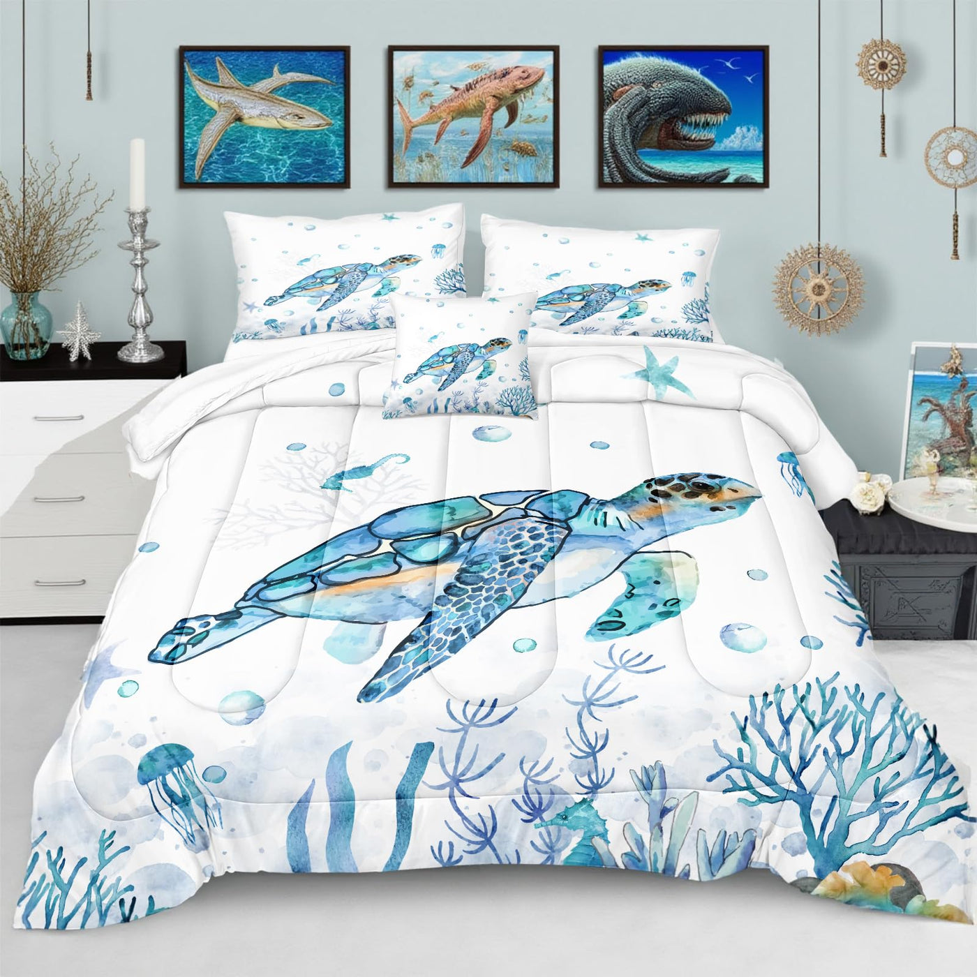 Sea Turtle Comforter Ocean Beach Bedding Twin Size Set Teal Blue Turtle Sea Horse Starfish Ocean Theme Printed Coastal Comforter
