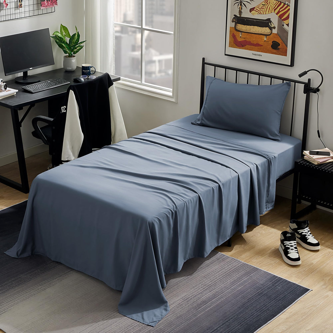 SLEEP ZONE Super Soft Cooling Twin Bed Sheets Set for Kids 3 Piece - Easy Care Fitted Flat Sheet & Pillowcase Sets - Wrinkle Free, Fade Resistant, Deep Pocket 16' (Flint Blue, Twin)
