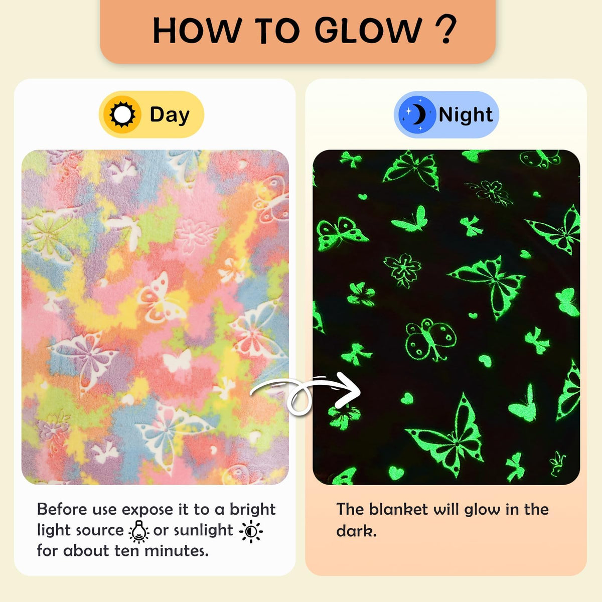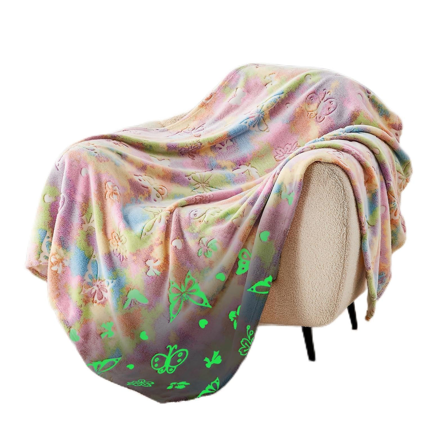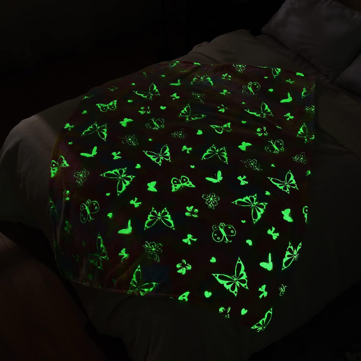 Q: What makes the SOCHOW Butterfly Glow in The Dark Blanket unique?A: The SOCHOW Butterfly Glow in The Dark Blanket is unique due to its ability to glow in the dark. By exposing it to a bright light source for about ten minutes, the blanket absorbs light and emits a soft glow, adding a fun and magical element to nighttime use.