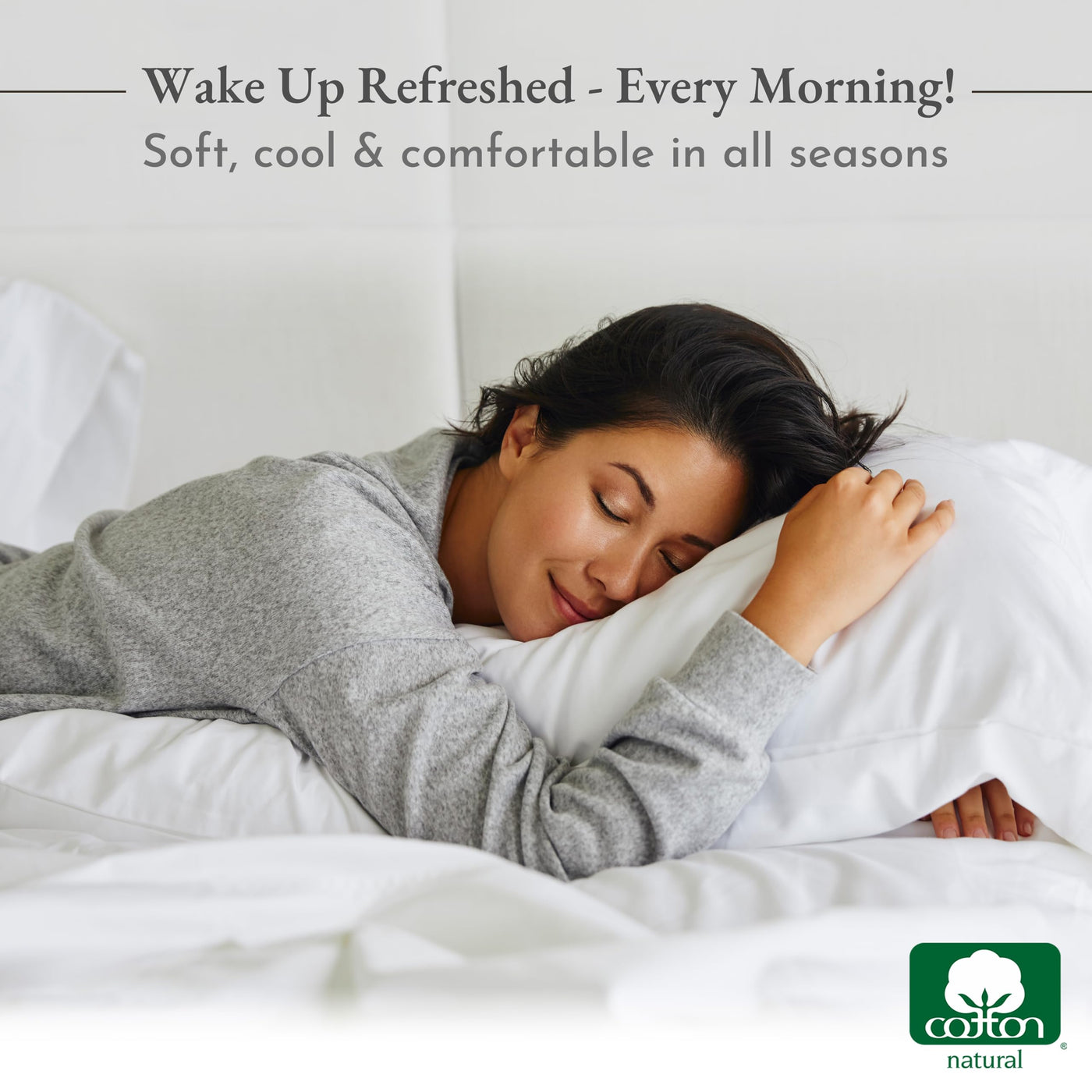 Sleep calmly with our 400 thread count pillowcases that provide incredible softness, comfort, and durability. Choice is yours: 100% Naturally-Sourced Cotton Pillowcases or Artificial Microfiber Pillowcases Ever wondered why luxury hotels use 100% cotton pillowcases while cheap motels use microfiber? Cotton pillow covers are smooth, durable and naturally easy on the skin, while microfiber gets hot and builds odor. Microfiber is made from non-biodegradable plastic fiber which causes pollution, whereas cotton is from plants - safe, pure and natural. Hence at California Design Den, we prefer pure cotton above any other fabric. Pure Cotton Smooth Pillow Cases with Lustrous Sateen Weave for Ultimate Comfort Our pillowcases are made of 400 threads per inch, and a lustrous sateen weave for durability, softness, and breathability. They are made using pure cotton yarns for the most comfortable sleeping experience. Pair our pillow covers with a flat sheet, fitted sheet, duvet protector, and coverlet to bring elegance to your bedroom. Premium Quality Pillowcases (Two Piece) With a Perfect Fit - Authentic & Tested The 400 thread count pillowcases are sold separately and offer the quality and luxury of high-grade Egyptian pillowcases. Our pillowcases are made using the highest quality dye which is color fastness, machine washable and gets softer after every wash. The fabric is tested for no pilling, shrinkage, tear strength, and thread count authenticity for durability and easy care. Exceptional Craftsmanship to Create Safe and Luxurious Bedding Expertly and ethically made, our pillowcases are stitched to perfection to provide the look and feel of Supima and silk pillowcases for luxury, style, and comfort. Our customers are happier not just comfortably enveloped in soft breathable cotton but knowing our pillowcases were made without undesirable substances and pollutive substances.