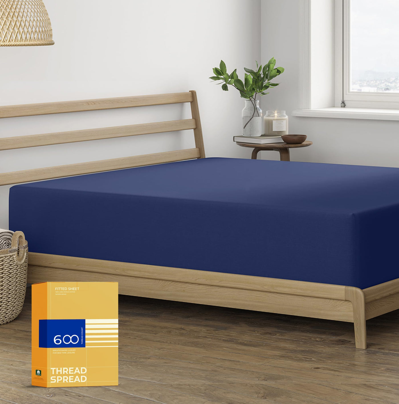 Thread Spread 100% Egyptian Cotton Fitted Sheet Twin Size - 600 Thread Count 16' Deep Pocket Twin Fitted Sheet Only, Soft Cooling Elastic Bottom Sheet, Fits College Dorm Mattress, Teens - Navy Blue