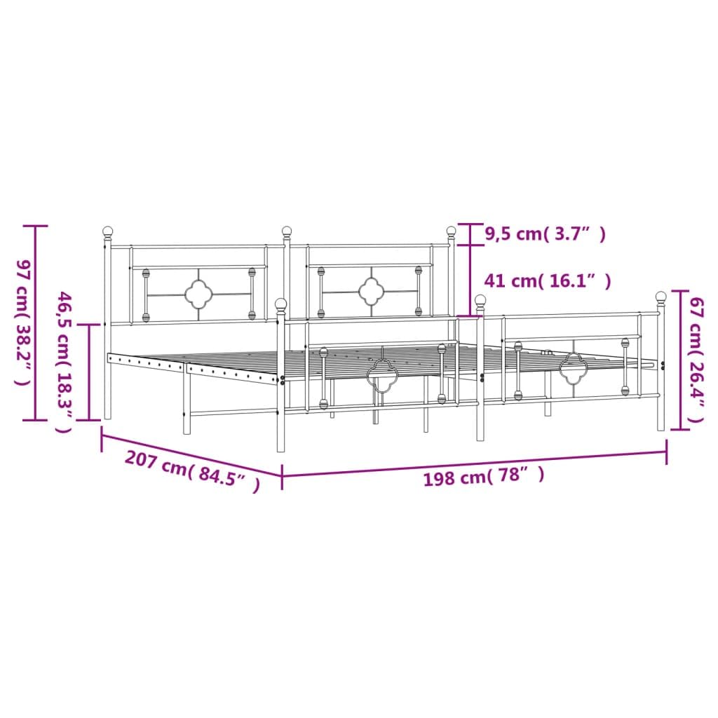 If you are looking for a robust bed frame for your bedroom, then this classic bed frame featuring an elegant and timeless design is a great choice for you! Robust metal construction: The bed frame is made from powder-coated steel. Steel is an exceptionally hard and strong material that offers exceptional sturdiness and stability.Metal slats and legs: The metal bed frame is complete with metal slats and center legs to provide your mattress with much-needed support and breathability.Extra storage space: For your convenience, the guest bed also has an extra space underneath for keeping your storage boxes out of sight.Functional headboard and footboard: The headboard and footboard of the bed base keep your mattress in place. Also, the headboard provides you with excellent back support when you sit up in bed to read or watch TV. Good to know:A mattress is not included with this bed. We do offer a various selection of mattresses. You can check our shop for a matching mattress.Color: WhiteMaterial: SteelOverall dimensions: 81.5" x 78" x 38.2" (L x W x H)Clearance height under the bed: 10.2"Suitable mattress size: 76" x 79.9" (W x L) King (mattress is not included)Assembly required: YesCalifornia Proposition 65 –:: – .
