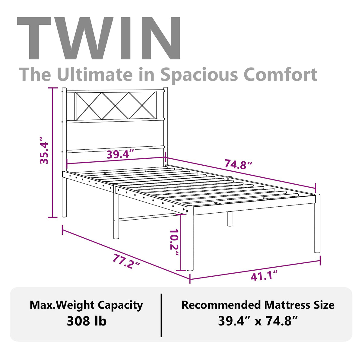 If you are looking for a robust bed frame for your bedroom, then this classic metal bed frame featuring an elegant and timeless design is a great choice for you! Robust metal construction: The bed frame is made from powder-coated steel. Steel is an exceptionally hard and strong material that offers exceptional sturdiness and stability.Metal slats and legs: The metal bed is complete with metal slats and center legs to provide your mattress with much-needed support and breathability.Extra storage space: For your convenience, the guest bed also has an extra space underneath for keeping your storage boxes out of sight.Excellent support: The headboard of the bed base provides you with excellent back support when you sit up in bed to read or watch TV. Good to know:A mattress is not included with this bed. We do offer a various selection of mattresses. You can check our shop for a matching mattress. Color: White Material: Steel Overall dimensions: 77.2" x 41.1" x 35.4" (L x W x H)Clearance height under the bed: 10.2"Suitable mattress size: 39.4" x 74.8" (W x L) Twin (mattress is not included)Assembly required: YesCalifornia Proposition 65 –:: – .