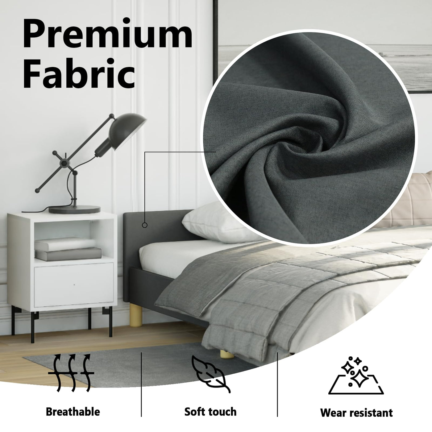 Get a better restful night's sleep from this bed frame with headboard! It makes a welcoming addition to any bedroom. Durable fabric: The fabric features a simple and clean look, and is breathable and durable.Supportive legs: The bed is supported by sturdy legs, which ensure its stability, safety and firmness.Plywood slats: The plywood slats provide good weight distribution, ensuring that the mattress stays in place with every twist and turn of your body during sleep. –::The delivery includes a bed frame only. The mattress is not included. You can check our shop for the matching mattresses.Each product comes with an assembly manual in the box for easy assembly.Color: Dark grayMaterial: Fabric (100% polyester), plywood, engineered woodOverall dimensions: 81.1" x 78.3" x 19.7" (L x W x H)Suitable mattress size: 76" x 79.9" (W x L) King (mattress not included)California Proposition 65