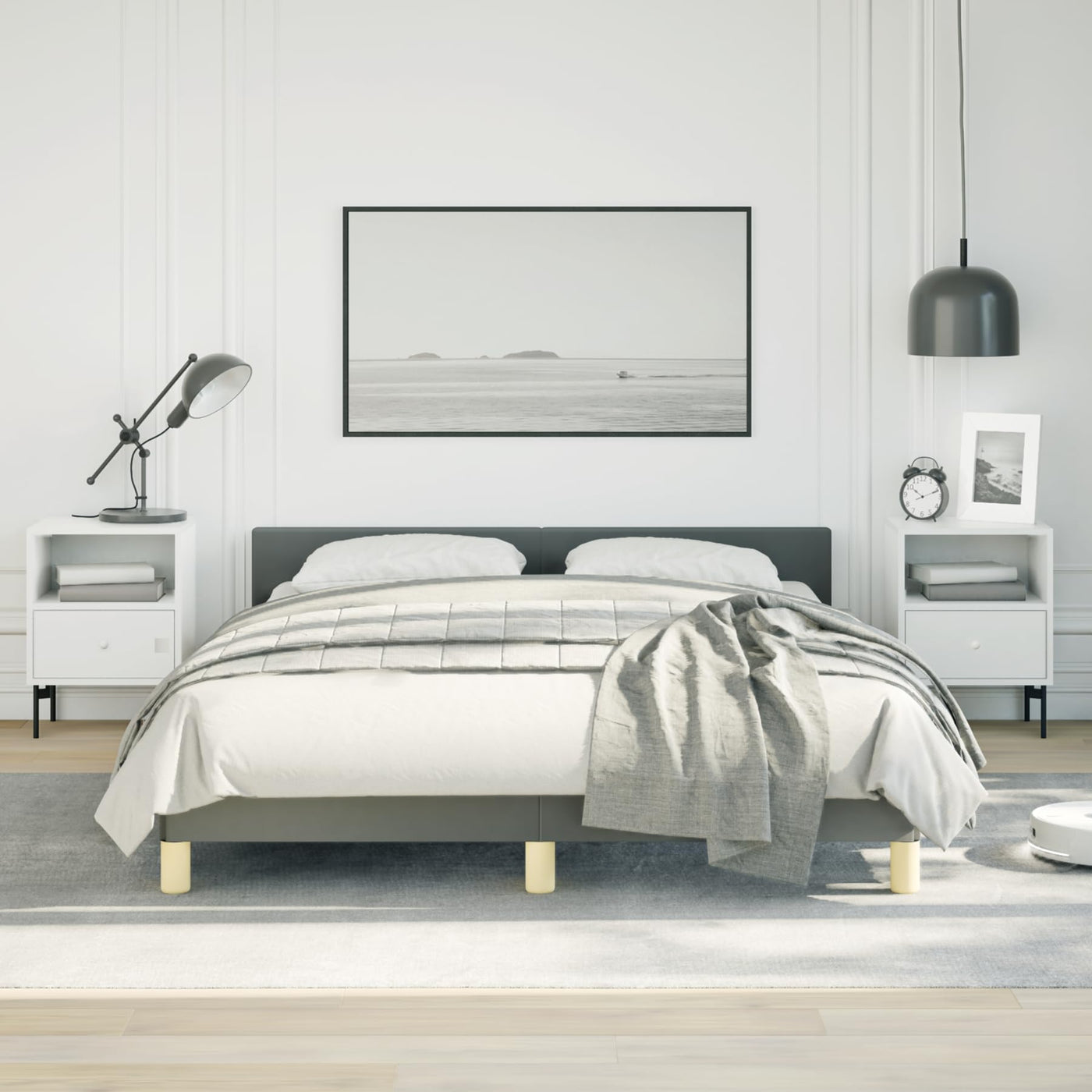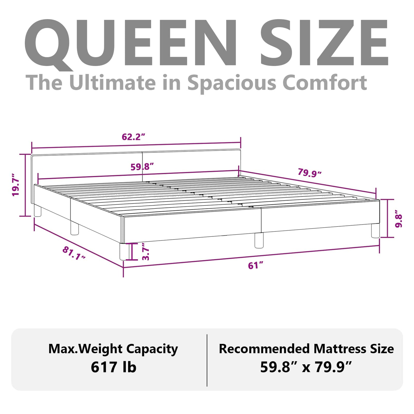Get a better restful night's sleep from this bed frame with headboard! It makes a welcoming addition to any bedroom. Durable fabric: The fabric features a simple and clean look, and is breathable and durable.Supportive legs: The bed is supported by sturdy legs, which ensure its stability, safety and firmness.Plywood slats: The plywood slats provide good weight distribution, ensuring that the mattress stays in place with every twist and turn of your body during sleep. –::The delivery includes a bed frame only. The mattress is not included. You can check our shop for the matching mattresses.Each product comes with an assembly manual in the box for easy assembly.Color: Dark grayMaterial: Fabric (100% polyester), plywood, engineered woodOverall dimensions: 81.1" x 62.2" x 19.7" (L x W x H)Suitable mattress size: 59.8" x 79.9" (W x L) Queen (mattress not included)California Proposition 65