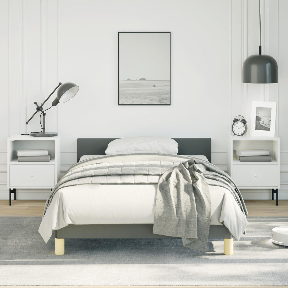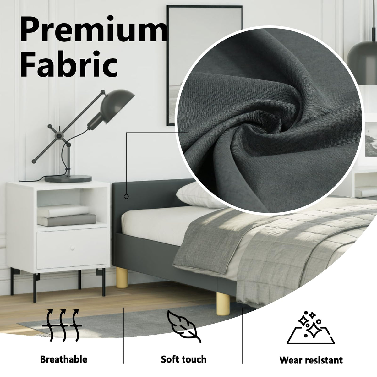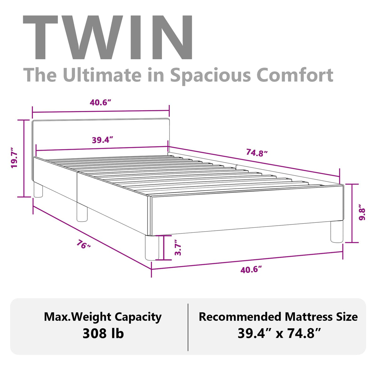 Get a better restful night's sleep from this bed frame with headboard! It makes a welcoming addition to any bedroom. Durable fabric: The fabric features a simple and clean look, and is breathable and durable.Supportive legs: The bed is supported by sturdy legs, which ensure its stability, safety and firmness.Plywood slats: The plywood slats provide good weight distribution, ensuring that the mattress stays in place with every twist and turn of your body during sleep. –::The delivery includes a bed frame only. The mattress is not included. You can check our shop for the matching mattresses.Each product comes with an assembly manual in the box for easy assembly.Color: Dark grayMaterial: Fabric (100% polyester), plywood, engineered woodOverall dimensions: 76" x 40.6" x 19.7" (L x W x H)Suitable mattress size: 39.4" x 74.8" (W x L) Twin (mattress not included)California Proposition 65