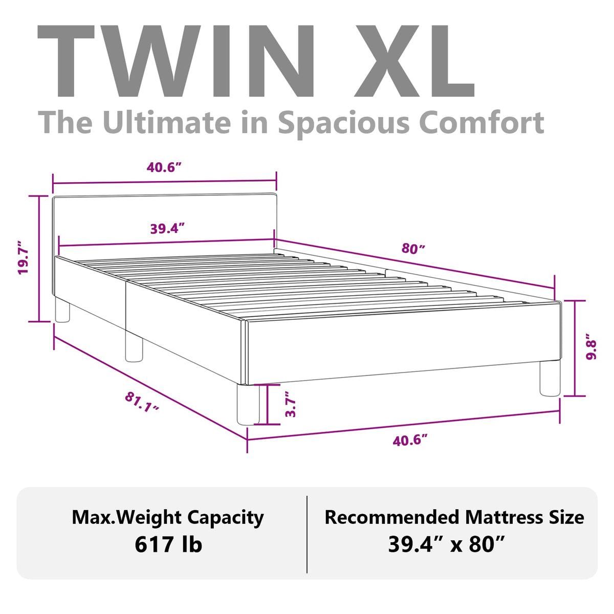 Get a better restful night's sleep from this bed frame with headboard! It makes a welcoming addition to any bedroom. Durable fabric: The fabric features a simple and clean look, and is breathable and durable.Supportive legs: The bed is supported by sturdy legs, which ensure its stability, safety and firmness.Plywood slats: The plywood slats provide good weight distribution, ensuring that the mattress stays in place with every twist and turn of your body during sleep. –::The delivery includes a bed frame only. The mattress is not included. You can check our shop for the matching mattresses.Each product comes with an assembly manual in the box for easy assembly.Color: Light grayMaterial: Fabric (100% polyester), plywood, engineered woodOverall dimensions: 81.1" x 40.6" x 19.7" (L x W x H)Suitable mattress size: 39.4" x 79.9" (W x L) Twin XL (mattress not included)California Proposition 65 –:: This product can expose you to chemicals including wood dust, which is known to the State of California to cause cancer. For more information go to .