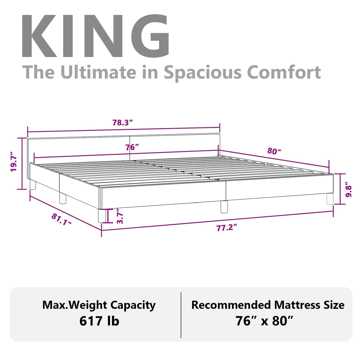 Get a better restful night's sleep from this bed frame with headboard! It makes a welcoming addition to any bedroom. Durable faux leather: Premium faux leather is a highly durable material. It is resistant to stain, making it easy to clean with a damp cloth. The smooth surface also gives a luxurious look and the beauty of real leather.Supportive legs: The bed is supported by sturdy legs, which ensure its stability, safety and firmness.Plywood slats: The plywood slats provide good weight distribution, ensuring that the mattress stays in place with every twist and turn of your body during sleep. –::The delivery includes a bed frame only. The mattress is not included. You can check our shop for the matching mattresses.Each product comes with an assembly manual in the box for easy assembly.Color: BlackMaterial: Faux leather (75% polyvinylchloride, 5% cotton, 20% polyester), plywood, engineered woodOverall dimensions: 81.1" x 78.3" x 19.7" (L x W x H)Suitable mattress size: 76" x 79.9" (W x L) King (mattress not included)California Proposition 65