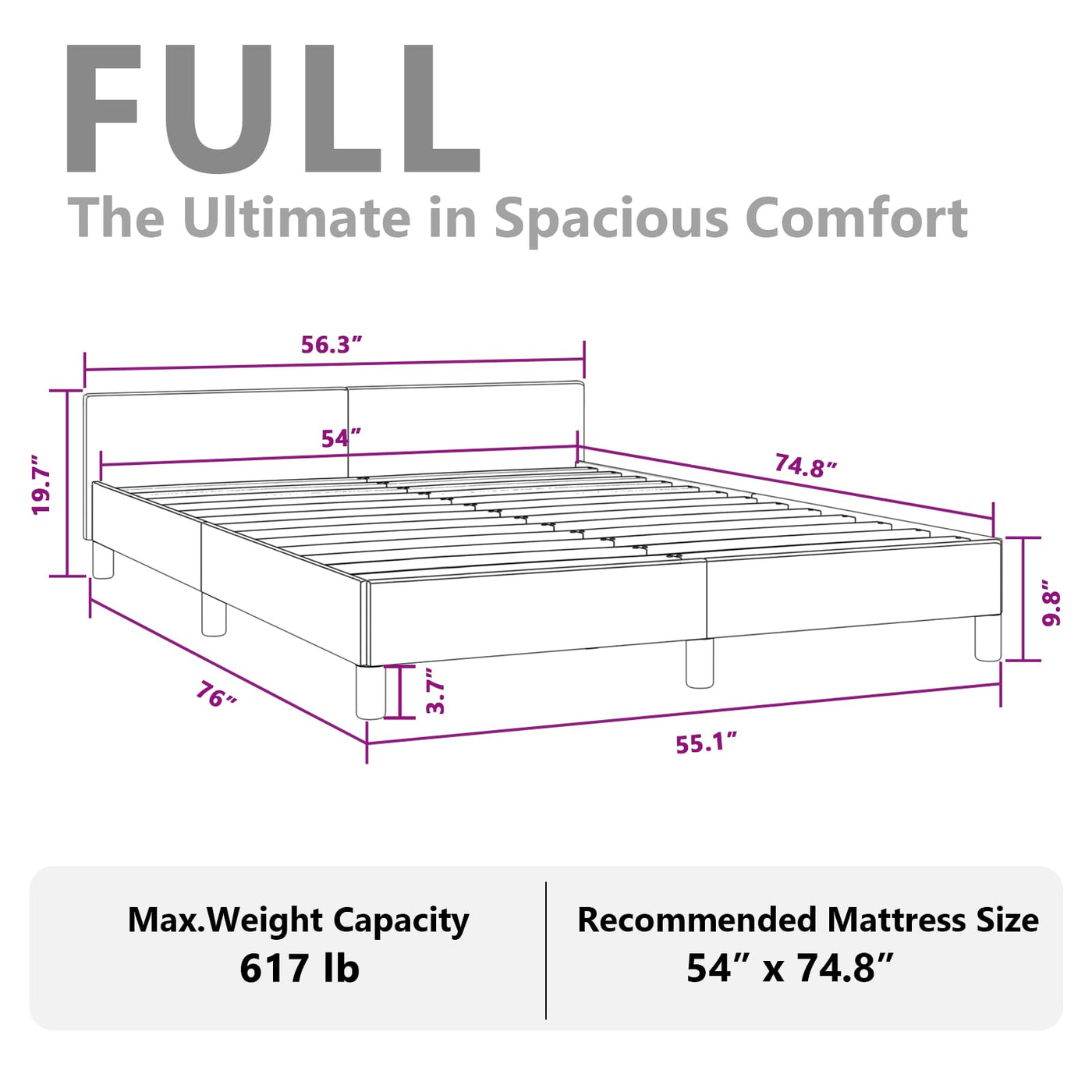 Get a better restful night's sleep from this bed frame with headboard! It makes a welcoming addition to any bedroom. Durable faux leather: Premium faux leather is a highly durable material. It is resistant to stain, making it easy to clean with a damp cloth. The smooth surface also gives a luxurious look and the beauty of real leather.Supportive legs: The bed is supported by sturdy legs, which ensure its stability, safety and firmness.Plywood slats: The plywood slats provide good weight distribution, ensuring that the mattress stays in place with every twist and turn of your body during sleep. –::The delivery includes a bed frame only. The mattress is not included. You can check our shop for the matching mattresses.Each product comes with an assembly manual in the box for easy assembly.Color: WhiteMaterial: Faux leather (75% polyvinylchloride, 5% cotton, 20% polyester), plywood, engineered woodOverall dimensions: 77.6 x 56.3 x 19.7 (L x W x H)Suitable mattress size: 53.9 x 74.8 (W x L) Full (mattress not included)California Proposition 65 –:: This product can expose you to chemicals including wood dust, which is known to the State of California to cause cancer. For more information go to .