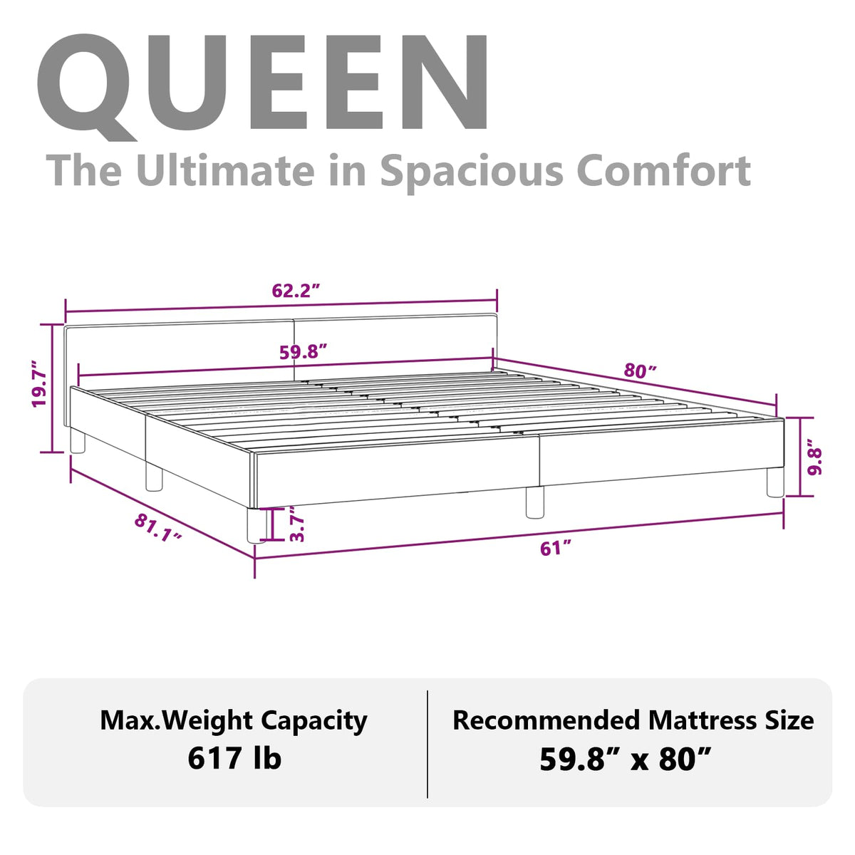 Suitable mattress size: 59.8" x 79.9" (W x L) Queen (mattress not included)