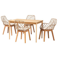 Cultivate an air of peace for every meal with the exotic craftsmanship of the Ballerina dining set. Made in Indonesia, this Bohemian set includes four chairs and one table crafted from sturdy wood. Each chair features a handcrafted rattan seat fitted with armrests as well as a plush fabric upholstered cushion to encourage casual relaxation. The Ballerina requires assembly and utilizes a broad, rectangular tabletop with rounded corners to accommodate each member of the table. Sporting a cozy design with minimalist charm, the Ballerina dining set is sure to become a beloved arrangement. Due to the nature of the natural materials used in this product, it may have variations in areas such as, but not limited to, color, pattern, grain and texture. The hair-like strands of rattan/rattan-fiber are common due to nature of the material.