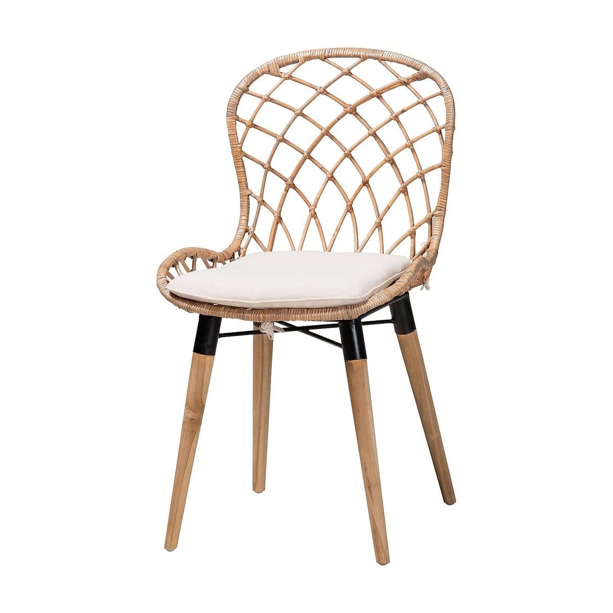Discover the blissful nature of everyday occasions with the exotic charm of the Sabelle dining set. Made in Indonesia, this Boho set includes four chairs and one table crafted from sturdy wood. Each chair features a handcrafted rattan seat fitted with a foam-padded and fabric upholstered cushion for a serene display with sumptuous comfort. The Sabelle requires assembly and features a broad, rectangular tabletop with rounded corners to offer ample space for each member of the table. Imparting a quality of carefree elegance, the Sabelle dining set elevates the feel of any layout. Due to the nature of the natural materials used in this product, it may have variations in areas such as, but not limited to, color, pattern, grain and texture. The hair-like strands of rattan/rattan-fiber are common due to nature of the material.