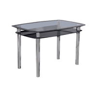 Give your dining room a more unique and contemporary look with this glass dining table. Table is made of glass and chrome silver base. The glass top has a smoked finish with black trimming. It also comes with a shelf.