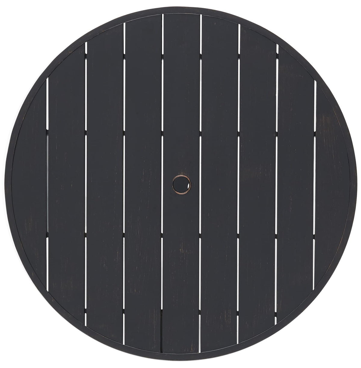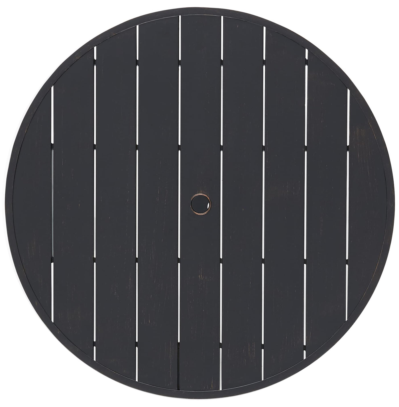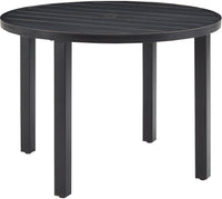 Gather around the Kaplan Round Dining Table for a cozy meal al fresco. The round table features a slatted design that elevates the sturdy steel construction. A standard umbrella hole allows you to add some shade on a hot summer day. Simple and stunning, the Kaplan dining table will be a welcome addition to your outdoor entertaining.