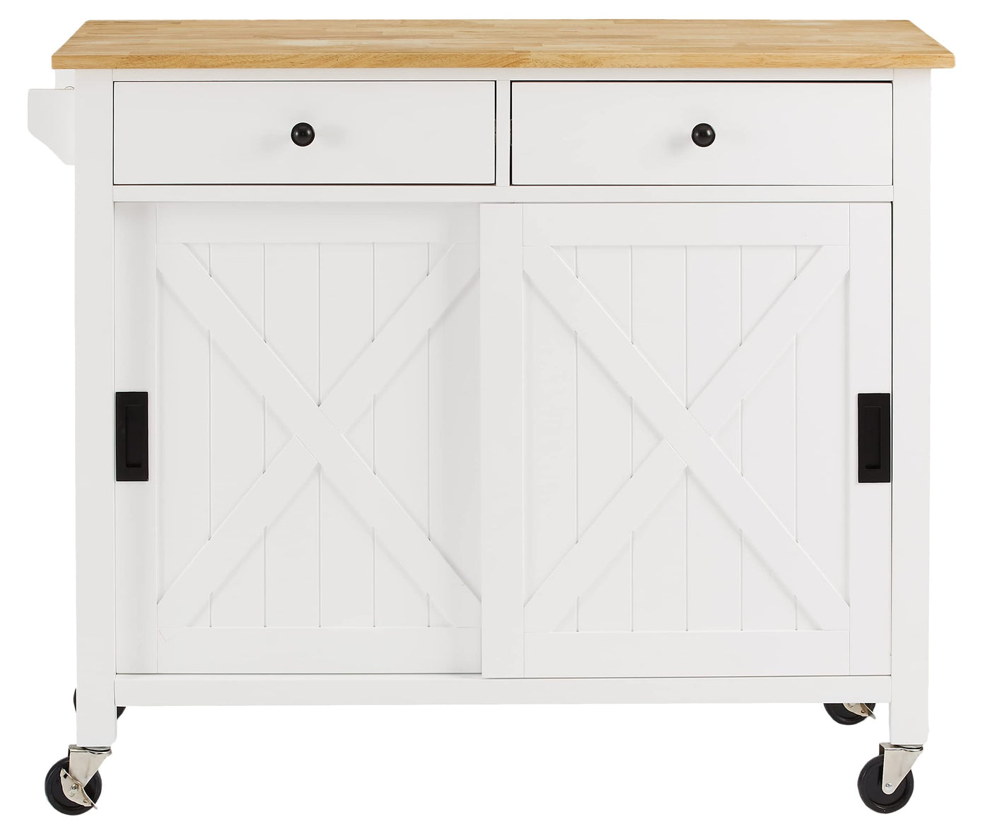 The Laurel Kitchen Island/Cart adds farmhouse charm to kitchen storage. Full-extension drawers offer space to tuck small items, while the lower cabinet showcases a sliding barn door motif. Featuring optional casters for mobility, the Laurel Kitchen Island/Cart brings flexible organization and counter space wherever it goes.