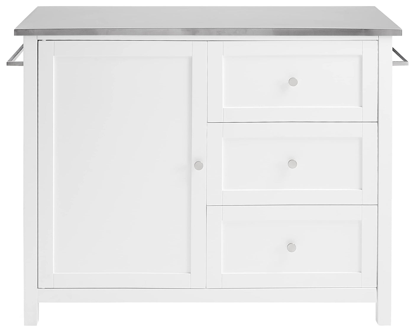 Expand your kitchen storage in style with the Soren Kitchen Island/Cart. Featuring a large cabinet with an adjustable shelf, plus three full-extension drawers, this kitchen island holds everything from cookware and utensils to small appliances and linens. Showcasing shaker-style cabinetry and a beautiful stainless steel countertop, your kitchen workspace will be the envy of the neighbors. With optional caster wheels, this kitchen essential can be used as a stationary island or mobile kitchen cart.