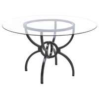 Aviano presents a contemporary dining masterpiece that's truly captivating. The meticulously crafted metal table base boasts four curvaceous legs converging around an interlocking ring waist, adorned with a surprising gunmetal finish. Crowned with a 6mm 48 diameter clear tempered glass, it seamlessly blends grace and modernity. Discover the allure of the transitional glass dining table, exuding casual charm. Its clear glass round elegantly rests on a captivating base with four stylized M legs, artistically interlocked in a ring motif and adorned with a rich gunmetal finish. At 30 inches, it's the perfect addition for a chic breakfast nook or a stylish eat-in kitchen, infusing a touch of timeless elegance.