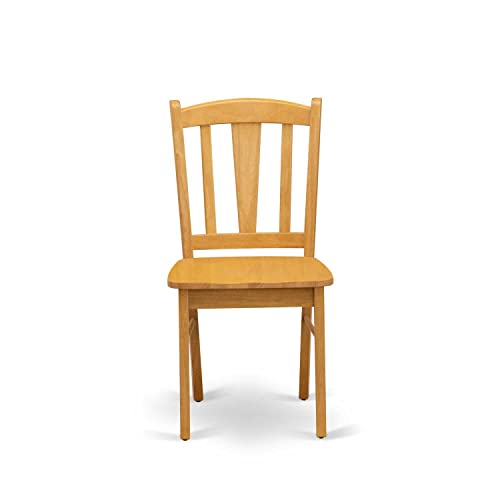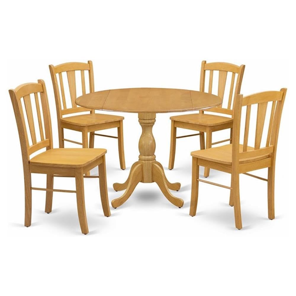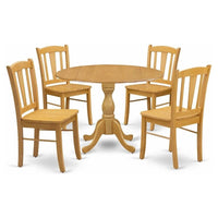 EAST WEST FURNITURE - DMDL5-Oak-W - 5-Pc DINING TABLE SETOur 5-piece dining table set includes 4 mid century dining chairs and 1 Dropleafs wood dining table. These kitchen chairs have a wooden seat, Slatted Chair Back and the dining room table consists of a round table top and pedestal Legs. We have created these modern dining chairs and dining table with the help of highly experienced carpenters, who develop a smooth and high-end finish to this kitchen dining set. We try to offer innovation as well as ease to put together. This superior quality dinette set is great for you and any dining area. This dining table set can be used for casual home parties or intimate gatherings.FEATURES:Frame Material: Asian Solid WoodWooden Chairs Seating Material: Wooddining room chairs Legs Color: OakRound Dining Table Base Color: OakDining Table top Color: OakModern Chair Dimensions: Length 18; Width 20; Height 35.Modern Kitchen Table Dimensions: Length 42; Width 42; Height 29.5.Include in the Package: 5-Piece Dining Room Table Set 4 Dining Chair and 1 Dining Table.