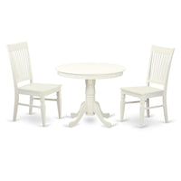 EAST WEST FURNITURE - ANWE3-LWH-W- 3-PIECE DINING TABLE SETThis fantastic round dining table can make an exceptional impression on both traditional and modern decor styles. This contemporary kitchen table set will add a great amount of charm to your dining room. The attractive 3-piece Traditional dinner table set highlights its curves and details, giving a traditional set a modern touch. The unique Linen White dining room chairs and wooden dining table are made from Superior Quality Asian wood (Rubber Wood) that provides exceptional sturdiness and stability to the round wooden dinner table and dining chairs. The modern solid wood structure, comfortable wooden seat, slatted back, and reliable round wooden kitchen table provide a cutting-edge look to your kitchen, exceptional stability to the outstanding modern dining table set, and comfortable back support. The excellent size of this round dining table set makes it easy to carry, clean, assemble, and rearrange. The classic style of this special pedestal dining table complements any home decor, and the smooth Linen White wooden seat and slatted back of the wooden chairs provide comfort to users.PRODUCT FEATURES: Seat: Wooden Kitchen Table Color: Linen White Dining Room Chairs Color: Linen White Dining Table Dimensions: Length: 36; Width: 36; Height: 29.5. Dining Chairs Dimensions: Length: 23; Width: 18; Height: 39.Includes: 2 Kitchen Dining Chairs and 1 Pedestal Dining Table