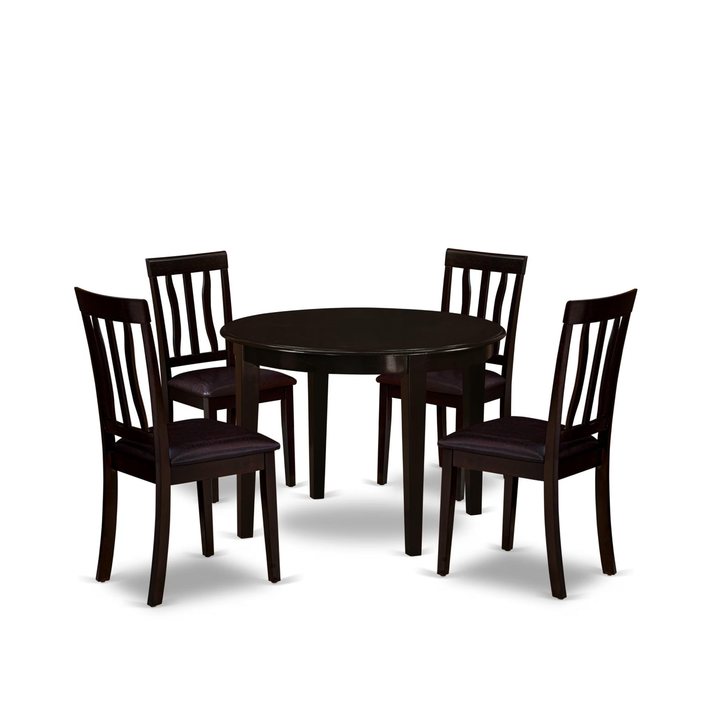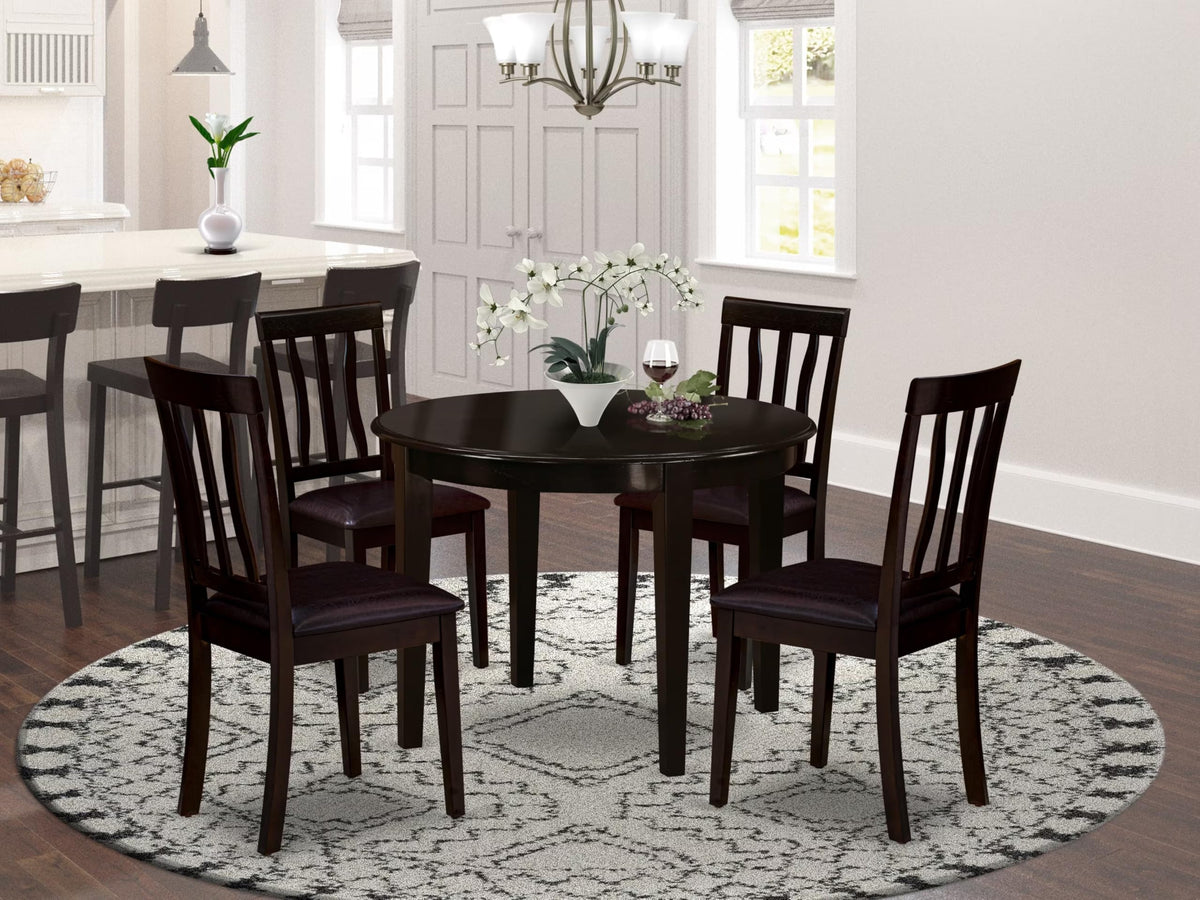 EAST WEST FURNITURE - BOAN5-CAP-LC - 5-PIECE ROUND kitchen SETIntroducing a beautiful modern kitchen table set that is perfect for your stunning dining room. This kitchen table set comes complete with 4 beautiful kitchen chairs and a wonderful wood table that will elevate the beauty of your dining room with its timeless design. The wood dining chair is fabricated with high-quality Faux leather, offering complete comfort and a lovely sitting experience. The wood dining table set boasts a Cappuccino hardwood kitchen table and frame, along with lovely dining chairs with a PU Leather seat and slatted back that bring elegance to your dining room and enhance its beauty. Our small dining table set is built with Asian wood, also known as Rubber wood, which offers great durability. Highly experienced carpenters have crafted these wooden dining chairs and wood table, providing a smooth and high-end finish to this modern dining table set. These classy modern dining chairs and 4 legs small dining table are easy to assemble if you follow the instructions included in the package. Our dining table set is easy to clean. You can use any furniture cleaner to clean this dining room table set, which only takes a little time. The wood dining table set is quite simple to clean and always provides a fresh look.PRODUCT FEATURES: Fabric: PU Leather Wood Color: Cappuccino Modern dining table Dimension: Length: 42; Width: 42; Height: 30. Dining chairs Dimension: Length: 20; Width: 18; Height: 38.5.Package Include: 4 Beautiful Modern Dining Chairs and a Lovely Dining Table."