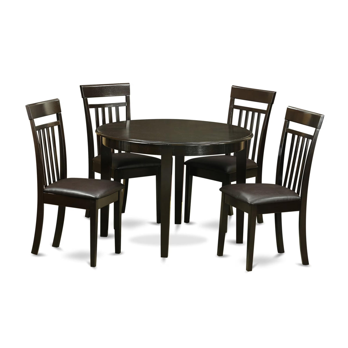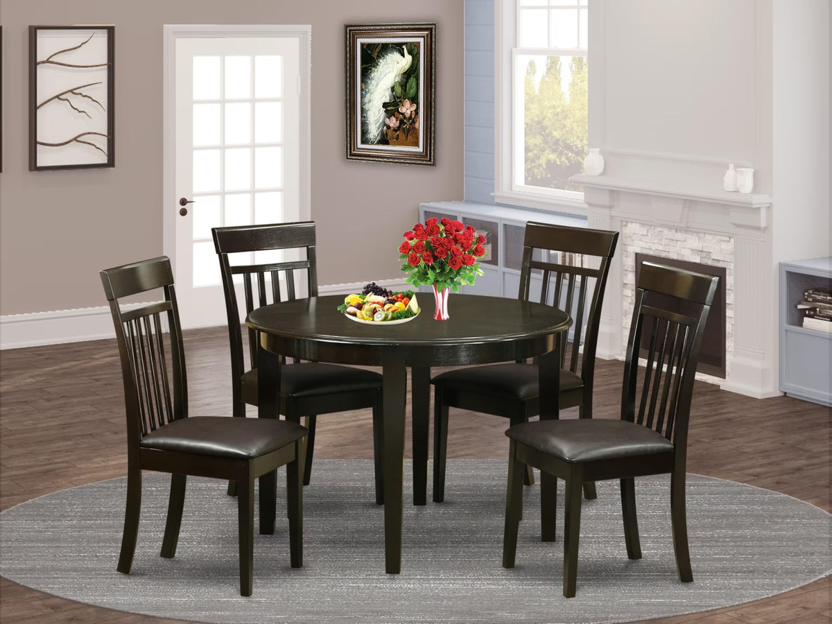 EAST WEST FURNITURE - BOCA5-CAP-LC - 5-PIECE DINING TABLE SETIntroducing a beautiful modern dining room set for your beautiful dining area. This dining set includes 4 beautiful modern dining chairs and a marvelous wood table that will enhance the beauty of your dining room with its timeless design. Our kitchen chairs are made of high-quality Faux leather, providing complete comfort and an attractive sitting experience. The kitchen set offers a Cappuccino hardwood dining table and frame, and a lovely wood dining chair with PU Leather seat and slatted back that bring elegance to your dining room and boost the beauty of your wonderful dining room. Our kitchen set offers great durability because it is built with Asian wood, also known as Rubberwood. We have created these wood chairs and the breakfast table with the help of highly experienced carpenters, who provide a smooth and high-end finish to this kitchen set. This classy dining chair and 4 legs kitchen table are easy to assemble if you follow the instructions included in the package. Our round kitchen set is easy to clean. You can clean this dining room set with any furniture cleaner, and it will only take a little time. The nook kitchen table set is quite simple to clean and always provides a fresh look.PRODUCT FEATURES: Fabric: PU Leather Wood Color: Cappuccino Table Dimension: Length: 42; Width: 42; Height: 30. Dining Chairs Dimension: Length: 20; Width: 17; Height: 38.Package Include: 4 Dining Chairs and A Dining Room Table.