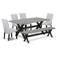 EAST WEST FURNITURE - X697BA105-6 - DINING TABLE SETOur dining set adds a touch of elegance to any dining room that you and your family will absolutely enjoy. The elegant 6 Piece modern dining set contains a modern dining table and a wood bench, 4 parson dining chairs. This rectangular modern table top is offered in a Cement finish. In addition, the dining chairs in a Grey Linen Fabric enhance the elegance of any home. Ideal for dinette, kitchen and dining areas, this multi-functional dinette set seats up to 6 people, perfect for families to enjoy mealtimes together. A great addition to your dining area and a perfect ensemble that will strike your guests with its best impression. We have created these Grey finish dining chairs and wood dining table with the help of highly experienced carpenters, who generate a smooth and high-end finish to this dining room table set. Upholstered dining chairs of the dining set can be moved under the wooden table when you finish your meal, which our kitchen dining table set largely helps you save room space. Designed with easy and fast assembly in mind, each set comes conveniently flat packed with easy-to-follow instructions and all necessary tools included. Our premium quality dining room table set is perfect for you and your dining area as well as the kitchen area. Our mid century modern dining set is quite simple to clean and always offers a good appeal. The kitchen dining table set adds a refined touch to even your most casual family dinners. Keep Enjoy with East West Furniture!PRODUCT FEATURES:Material: RubberwoodFabric Material: Linen FabricTable Top Color: CementTable Legs Color: Wire Brushed BlackChairs Fabric Color: GreyChairs Legs Color: BlackChairs Back Style: High BackTable Dimensions: Length: 72; Width: 40; Height: 30.Chair Dimensions: Length: 22.5; Width: 18; Height: 38.5.Bench Dimensions: Length: 72; Width: 15; Height: 18.Package Include: Dining Set a Mi
