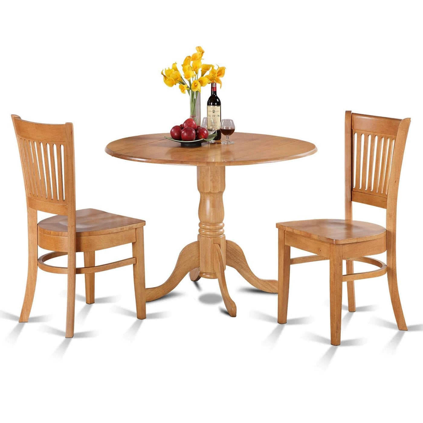 EAST WEST FURNITURE - DLVA3-OAK-W- KITCHEN TABLE SETThis 3-piece kitchen set comprises a Drops Leaf kitchen table and 2 dining chairs, designed to elevate the ambiance of your dining space. The dining table set's exquisite oak hue exudes sophistication, rendering it a seamless match for various kitchen decor styles and augmenting the overall visual allure. The contemporary chairs feature a Slatted Back and a Wooden Seat, while the dinner table boasts a Drops Leaf top and Pedestal, exuding an air of sophistication. Our highly experienced carpenters have crafted this high-quality set to perfection, ensuring a seamless and refined finish that speaks of superior craftsmanship. Ideal for both casual home gatherings and intimate occasions, this dining table set is effortless to assemble with clear and concise instructions provided for your convenience. As a customer-centric business, our topmost priority is your satisfaction, and we take pride in delivering exceptional products that exceed your expectations. You can purchase our products with confidence, knowing that your happiness is our driving force.PRODUCT FEATURES: Frame Material: Asian Wood Frame Color: Oak Table Top Style: Round Chair Back Style: Slatted Seat Material: Wood Chair Dimensions: Length: 20; Width: 17; Height: 37. Table Dimensions: Length: 42; Width: 42; Height: 29.5.Included in the Package: 2 Modern Dining Chairs and a Round Table.