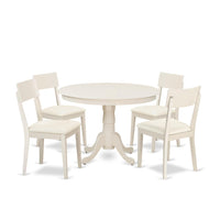 EAST WEST FURNITURE - HLAD5-LWH-LC - DINING ROOM SETEnhance the elegance of your dining room with this exquisite 5-Piece dining room table set. It consists of four mid-century dining chairs made of Faux Leather and a luxurious modern kitchen table with a pedestal. The kitchen dining table features a beautiful round design supported by four wooden pedestal legs. Both the table and chairs are crafted from high-quality Solid Wood and coated with a Linen White finish, giving them a durable and traditional appeal. This well-designed set is renowned for its modern aesthetic, making it a perfect fit for contemporary homes. Bringing this beautiful dining table set into your home will surely be a delight. Not only can you use it in the dining area, but it also works seamlessly in kitchens. The flexible and versatile nature of the dinner table makes it ideal for various dining occasions. The dining room chairs feature a high Ladder back design with Linen White Faux Leather seats and elegant legs. Designed for easy maintenance and daily use, the kitchen dining chairs are finished in Linen White, adding to their charm. With these comfortable Faux Leather dining room chairs, you can enjoy delightful meals, whether it's dinner, lunch, or breakfast, with your family, friends, or guests in a sophisticated dining environment. Assembling the pedestal dining table and dining chairs is a hassle-free process, and if you have any doubts, our team is always available to assist you. Purchase our products with complete confidence, as our utmost priority is to ensure customer satisfaction and happiness.PRODUCT FEATURES: Kitchen Chairs Seat Color: Linen White Kitchen Table Color: Linen White Dining Table Size: Length: 42; Width: 42; Height: 29.5. Wood Chairs Measurements: Length: 21; Width: 17; Height: 36.Included: A Wood Dining Table and 4 Dining Chairs.