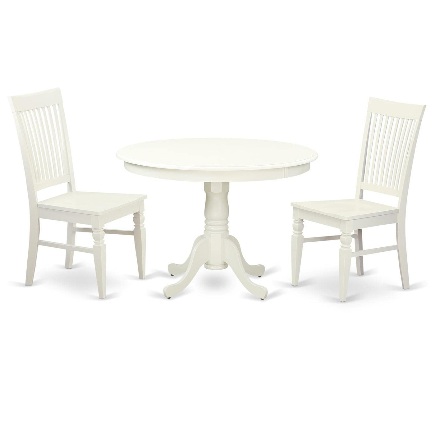 EAST WEST FURNITURE - HLWE3-LWH-W - DINNER TABLE SETThis 3-piece dining ensemble includes 2 kitchen chairs and a dining table. The chairs feature a wooden seat and slatted back, while the dining table boasts a round top perched on a pedestal leg. Both the round tabletop and pedestal legs are presented in a Linen White finish, as are the seats and legs of the dining chairs. This dining set is the handiwork of highly skilled carpenters, who confer a smooth and high-end finish to the set. This top-quality dining set is an ideal fit for any dining area and can be used for casual home gatherings or intimate occasions. We strive to deliver not just innovation but also ease of assembly. The table and chairs can be put together easily by following the instructions provided, but if any issues arise, feel free to contact us. Shop our products with confidence, as customer satisfaction is our number one priority!PRODUCT FEATURES: Frame Material: Asian Wood Frame Color: Linen White (Off White) Table Top Style: Round Chair Back Style: Slatted Seat Material: Wood Chair Dimensions: Length: 23; Width: 18; Height: 39. Table Dimensions: Length: 42; Width: 42; Height: 29.5.Included in the Package: 2 Modern Dining Chairs and a Dinner Table.