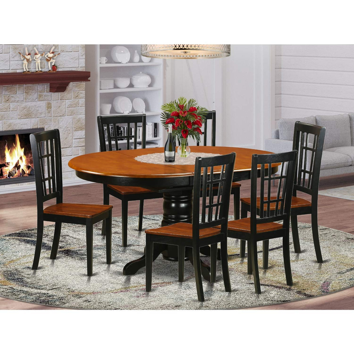 EAST WEST FURNITURE - KENI7-BCH-W - KITCHEN DINING SETThis contemporary kitchen table set consists of 6 dining room chairs and a breakfast table. The dining room chairs feature a wooden seat and slatted back, while the modern kitchen table is designed with a butterfly leaf oval top and a pedestal leg. The exquisite dinner table we offer presents a cherry table top with an enduring finish that seamlessly merges with the Black finish, guaranteeing its long-lasting quality. Complemented by the cozy wooden texture, the dining room chairs' wooden legs exude a contemporary elegance, effortlessly elevating the ambiance of any dining area with utmost sophistication. Adding this set to your dining room enhances its elegance. Our highly skilled carpenters have meticulously crafted these kitchen chairs and wooden dining table, ensuring a sleek and premium finish. This high-quality modern dining set is perfect for any dining area, whether you're hosting casual home parties or intimate gatherings. We strive to offer both innovation and ease of assembly. Following the provided instructions, you can effortlessly put together the butterfly leaf dinner table and kitchen chairs.PRODUCT FEATURES: Frame Material: Asian Wood Frame Color: Black and Cherry Table Top Style: Oval Chair Back Style: Slatted Seat Material: Wood Chair Dimensions: Length: 20; Width: 17; Height: 39. Table Dimensions: Length: 60/42; Width: 42; Height: 30.Included in the Package: 6 Modern Dining Chairs and a Dinner Table.