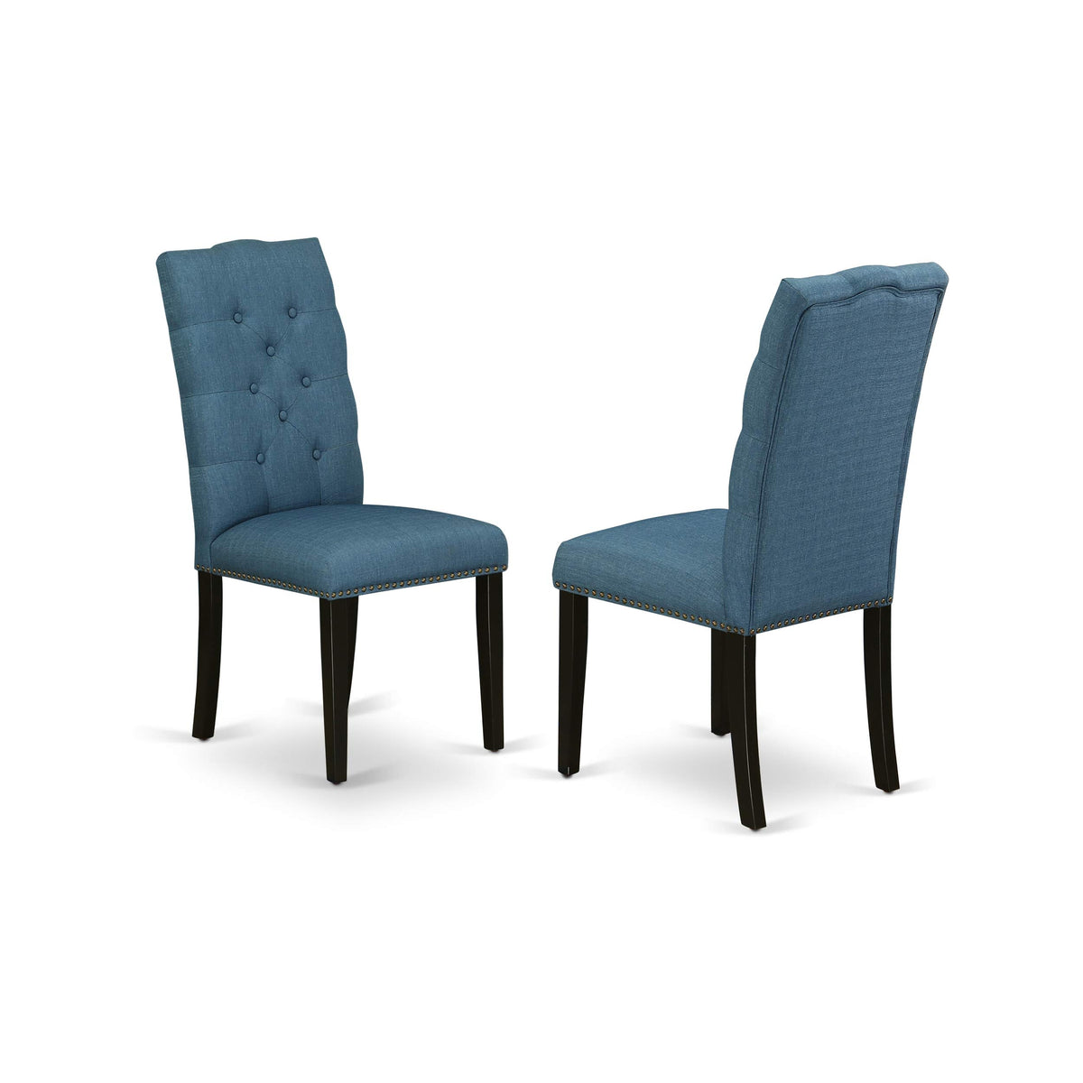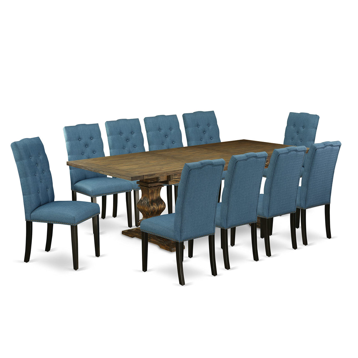 EAST WEST FURNITURE - LAEL11-71-21 - 11-PC MODERN DINING TABLE SETIntroducing our dining room set, a stylish addition that brings elegance to any dining area. This 11-piece kitchen table set consists of a dinner table and 10 matching dining room chairs. It effortlessly adds a touch of simplicity and modern charm to your home. Perfect for kitchens, kitchens, and dining areas, this set comfortably accommodates up to 10 people, making it ideal for family-style dinners and meals with friends. The dining table features a Distressed Jacobean Rectangular Table Top and Double Pedestal Legs with a finished look. The dining chairs boast Mineral Blue Linen Fabric Seats and Wire Brushed Black Wooden Chair Legs. With a Linen Fabric seat and Button Tufted Back, the dining room chairs offer both comfort and style. The kitchen chairs have a solid wood frame outline on the back, with a padded center. Crafted from high-quality Rubberwood, this dining set ensures exceptional durability and stability. Skilled carpenters have meticulously produced this kitchen table set, delivering a smooth and top-quality finish. Notably easy to clean, our table set consistently exudes an elegant appeal.PRODUCT FEATURES: Material: Asian Hardwood Table Shape: Rectangular Table Top Color: Distressed Jacobean Table Legs Color: Distressed Jacobean Chairs Finish: Wire Brushed Black Upholstered Material: Linen Fabric Chairs Fabric Color: Mineral Blue Chairs Back Style: Button Tufted Back Chair Weight Capacity: 300 lbs Table Dimensions: Length: 92/68; Width: 42; Height: 30. Chairs Dimensions: Length: 24.5; Width: 19; Height: 40.5.Include in this Package: 1 Wooden Table and 10 Dinning Room Chairs.