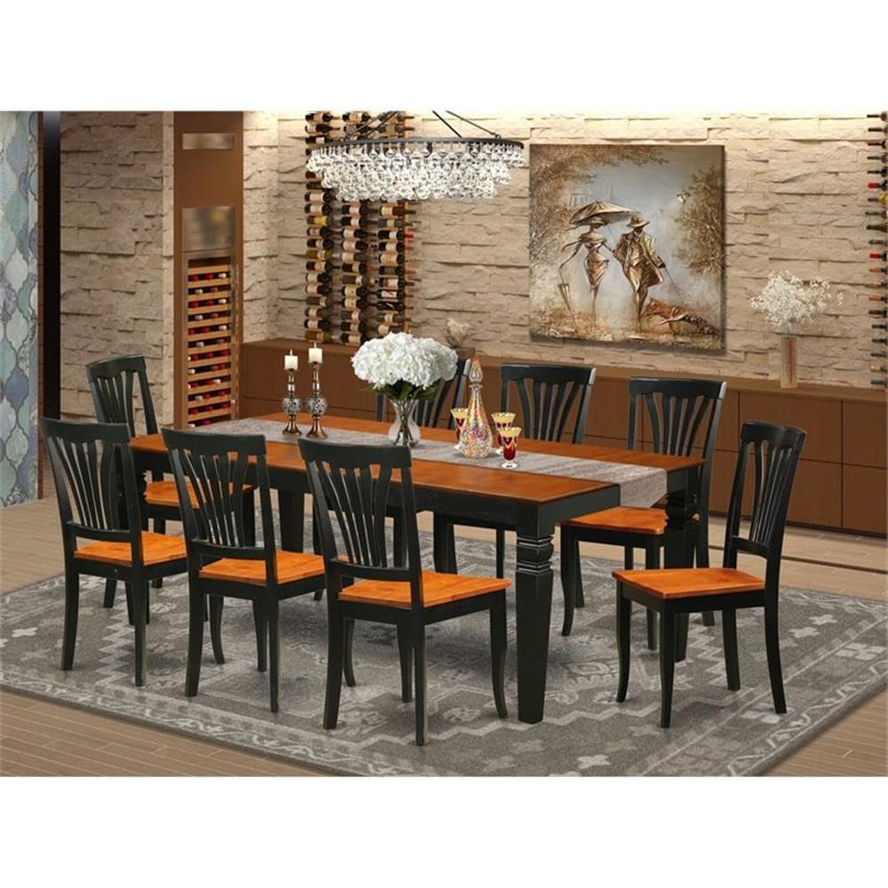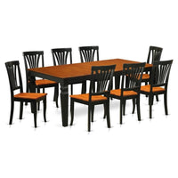EAST WEST FURNITURE - LGAV9-BCH-W - KITCHEN DINING TABLE SETThis 9-piece dining room table set includes 8 dinning room chairs and a butterfly leaf Dining Room Table. These dining chairs have a wooden seat, slatted back and the rectangular dining table consists of a rectangular top and 4 legs. It increases the grace of your dining room. We have created these mid century chairs and kitchen dining table with the help of highly experienced carpenters, who develop a smooth and high-end finish to this dining room set. This top quality dinette set is ideal for you and any dining area. This kitchen dining table set can be used for casual home parties or intimate gatherings. We try to offer innovation as well as ease to put together. You can assemble a self-storing butterfly leaf kitchen table and dinning room chairs easily according to the given instructions if you have any trouble feel free to contact us. Buy our products confidentially, because our 1st priority is to keep customers happy!PRODUCT FEATURES: Frame Material: Asian Wood Frame Color: Black & Cherry Seat Material: Wood Chair Dimensions: Length: 22; Width: 18; Height: 36. Table Dimensions: Length: 84/66; Width: 42; Height: 30.Included in the Package: 8 Wooden Chairs and a Dining Table.