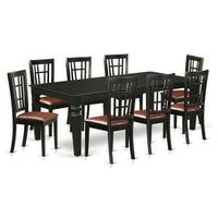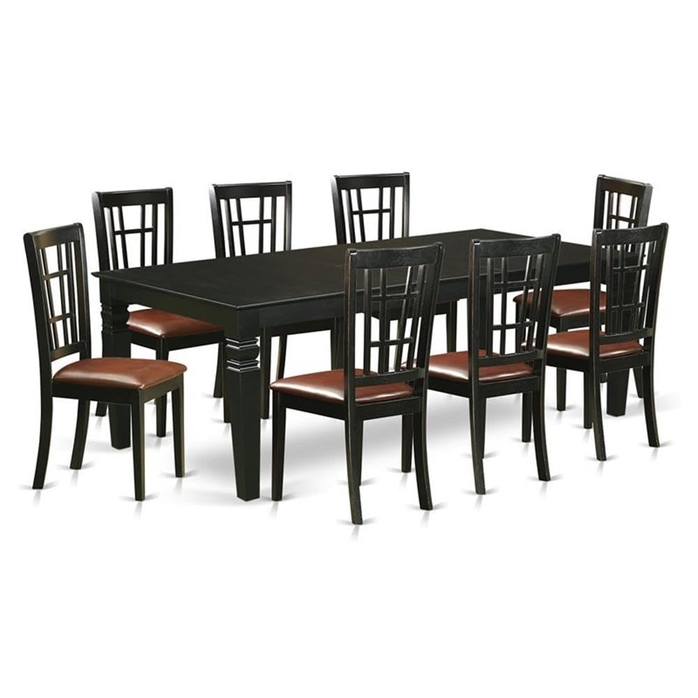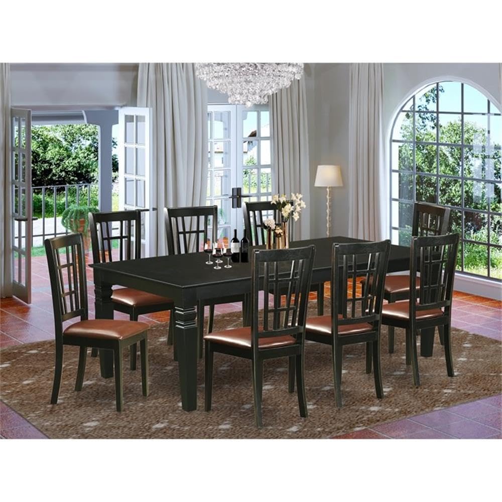 EAST WEST FURNITURE - LGNI9-BLK-LC - 9-PIECE KITCHEN DINING SETIntroducing an Exquisite Kitchen Dining Set for Your Beautiful Kitchen. This kitchen Set offers 8 wonderful kitchen dining chairs and a remarkable wood table, designed to elevate the beauty of your kitchen area. The dining chairs feature plush PU Leather seats, complemented by impressive Black finished legs, while the kitchen table showcases a harmonizing Black finish. Our modern dining set exudes elegance and sophistication, guaranteed to enhance the ambiance of your dining room. The kitchen set is meticulously coated with high-quality paints, creating a gentle texture on the solid wood and enhancing its overall visual appeal. The Kitchen chairs provide exceptional comfort with their luxurious PU Leather seats and supportive Wooden Slat backs, ensuring a delightful sitting experience and excellent back support. The Rectangular tabletop design with 4 legs adds to the allure of this dining table set. Each Dining chair and the Kitchen table is skillfully crafted by experienced carpenters, resulting in a high-class finish and superior quality. We have constructed this kitchen table set using superior quality Asian hardwood, commonly known as Rubber Wood, which offers outstanding sturdiness and stability. This kitchen set is compatible with almost all fine cleaners, enabling you to maintain its refreshing appearance. Whether using a furniture cleanser or any suitable cleaner, you can easily clean this Kitchen table set and enjoy its ever-inviting look.PRODUCT FEATURES: Chair Seat: PU Leather Frame Color: Black Table Legs: 4 Legs Table Top: Rectangular The dimension of the Dining Table: Length: 84/66; Width: 42; Height: 30. Measurements of Kitchen Chairs: Length: 20; Width: 17; Height: 39.Package Include: A Dining Table and 8 Modern Dining Chairs