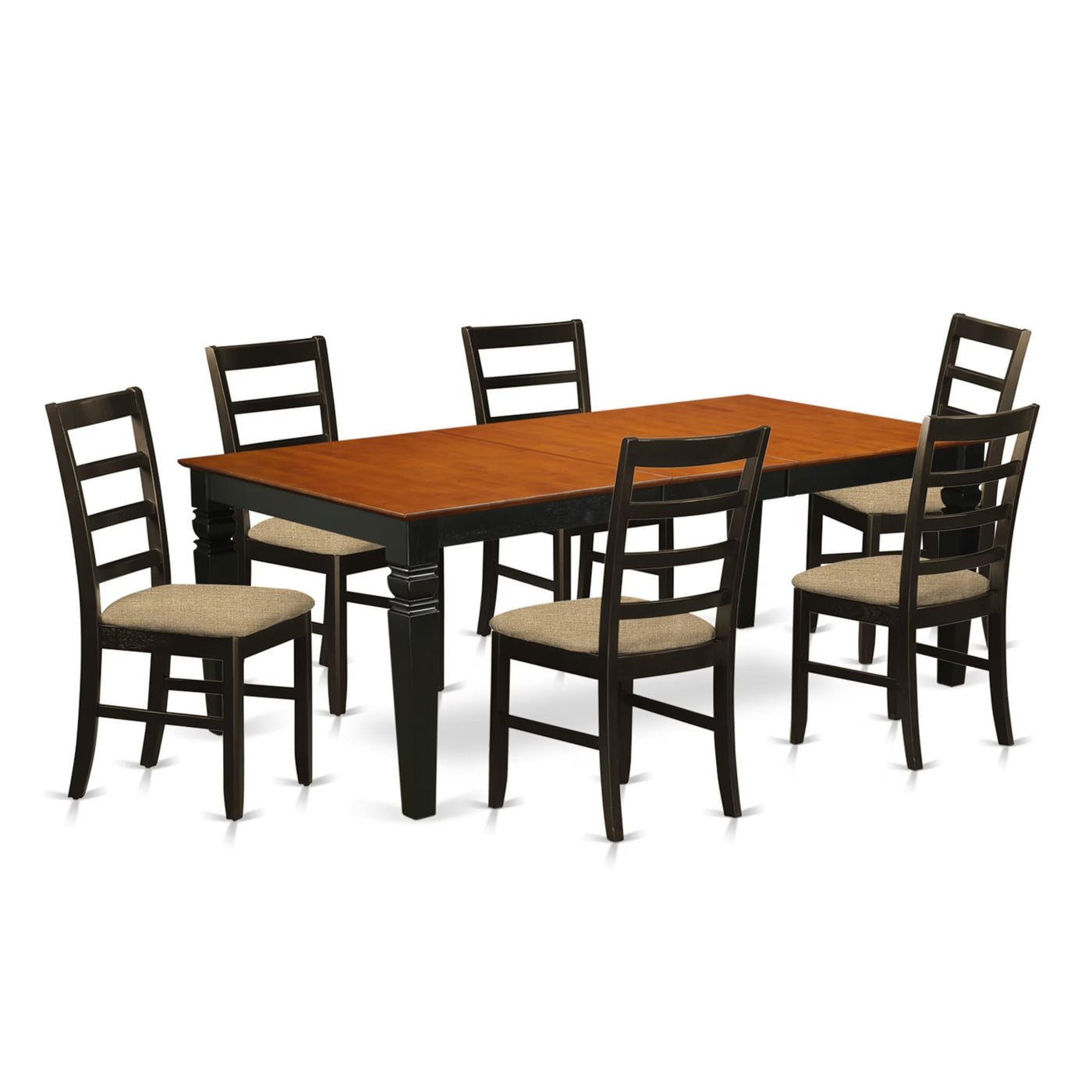EAST WEST FURNITURE - LGPF7-BCH-C - 7-PIECE KITCHEN DINING SETElevate your culinary space with this captivating Kitchen Set, complete with 6 dining chairs and a dining table to accentuate your kitchen's beauty. This modern dining ensemble enriches your dining area's charm, featuring dining chairs with comfortable linen fabric seats, complemented by striking black-finished legs, and a kitchen table in an attractive black and cherry finish. This contrasting color palette adds a stylish touch to your dining environment. The kitchen set is coated meticulously with high-quality paints, imparting a smooth and luxurious texture to the solid wood surfaces. The chairs are designed for comfort, with Linen Fabric seats and Wooden Slat backs that provide supportive coziness and a pleasant seating experience. The dining table, designed with a rectangular top and 4 leg base, further enhances the allure of this set. The use of high-quality Asian hardwood, known as Rubber Wood, in its construction imparts considerable durability and stability to the set. Apart from its design and quality, this dining set scores high on practicality too. The assembly process is straightforward and energy-saving, allowing you to easily put together this dining set at home. Maintenance is equally hassle-free. Most standard furniture cleaners work effectively on this kitchen set, helping maintain its fresh and appealing look.PRODUCT FEATURES: Chair Seat: Linen Fabric Frame Color: Black and Cherry Table Legs: 4 Legs Table Top: Rectangular The dimension of the Kitchen Table: Length: 84/66; Width: 42; Height: 30. Measurements of Dining Chairs: Length: 22; Width: 18; Height: 38.Package Include: A Modern Wooden Table and 6 Kitchen Dining Chairs