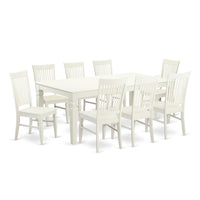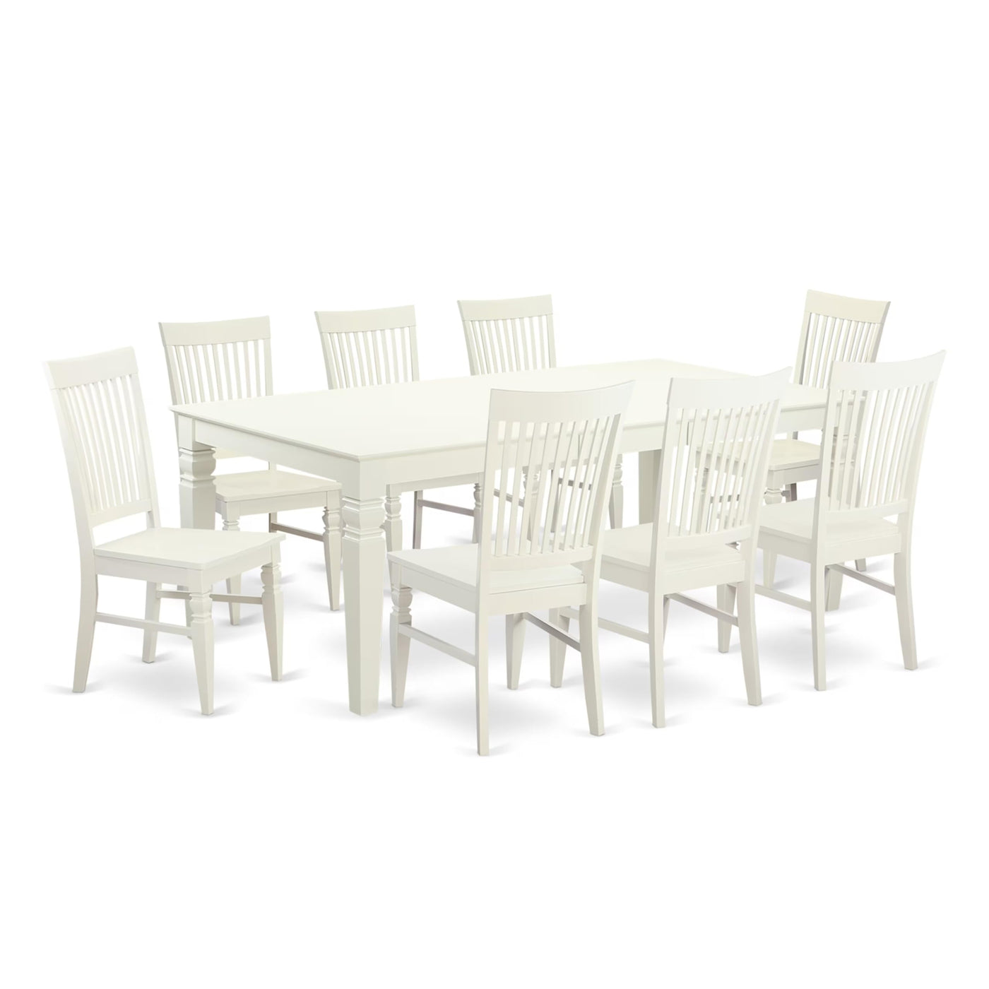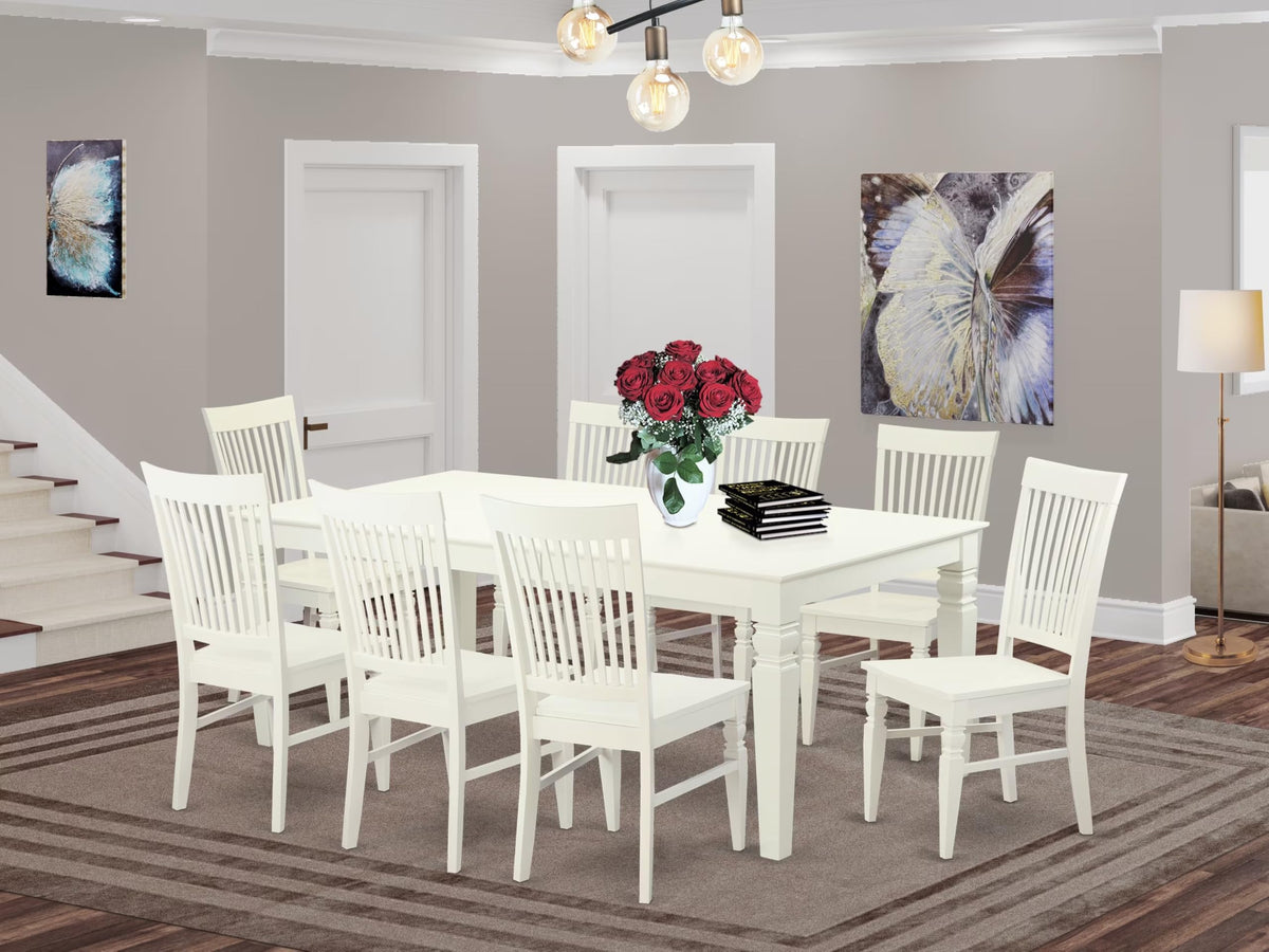 EAST WEST FURNITURE - LGWE9-LWH-W - kitchen SETIntroducing our remarkable 9-piece dinner table set, which includes 8 dining room chairs and a butterfly leaf dining table. These modern chairs feature a comfortable Wooden Seat and a stylish Slatted Back, while the dinner table is equipped with a butterfly leaf top and sturdy 4-legged construction. Our striking modern kitchen table showcases a durable finish, extending seamlessly from the Linen White tabletop to the matching wooden legs. Its versatile design is poised to enhance virtually any home decor, ensuring lasting appeal for years to come. Moreover, the Linen White finish on the wooden legs, combined with the inviting texture of the dining chairs, adds a touch of modern flair to any dining space. We have designed these dining chairs and dinner table with the assistance of highly experienced carpenters, ensuring a smooth and high-end finish for this kitchen set. This high-quality dining room set is ideal for you and any dining area, whether you're hosting casual home parties or intimate gatherings. We prioritize both innovation and ease of assembly. You can easily assemble the self-storing butterfly leaf modern table and dining chairs by following the provided instructions. Should you encounter any difficulties, please don't hesitate to contact us for assistance. Purchase our products with confidence, as customer satisfaction is our top priority!PRODUCT FEATURES: Frame Material: Asian Wood Frame Color: Linen White (off White) Table Top Style: Rectangular Chair Back Style: Slatted Seat Material: Wood Chair Dimensions: Length: 23; Width: 18; Height: 39. Table Dimensions: Length: 84/66; Width: 42; Height: 30.Included in the Package: 8 Dinner Chairs and a Rectangular Table.