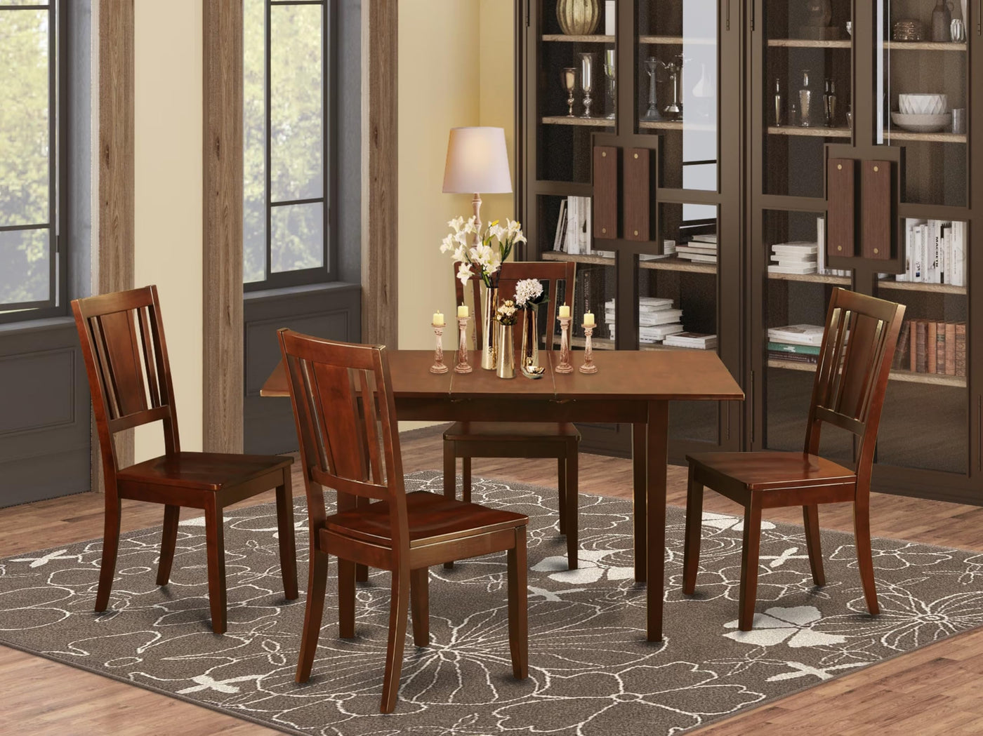 EAST WEST FURNITURE - NODU5-MAH-W - KITCHEN DINING TABLE SETPresenting our sophisticated 5-Piece Wood Dining Set, featuring a sleek, rectangular table and 4 exquisite chairs that elevate the ambiance of your dining room to new heights. The set boasts a distinctively glossy finish and provides unparalleled comfort, seamlessly combining style and practicality. This exquisite ensemble comprises four elegant dining chairs and a sophisticated butterfly leaf modern table. Discover our exquisitely crafted dining room table set, boasting an impeccably designed Mahogany-finished rectangular tabletop and meticulously matched legs. The chairs exude a sense of refinement with their elegantly polished Mahogany finish on both seats and legs, flawlessly complementing any interior decor. Our kitchen dining table set showcases a sophisticated design, meticulously fashioned from premium rubberwood - a renowned Asian wood with superior durability and eco-friendly attributes. The exceptional shock-absorbent features of this material guarantee long-lasting performance, making it an ideal and elegant addition to any professional setting or home environment. Crafted with meticulous attention to detail, the kitchen chairs feature a luxurious Wooden Seat and a tasteful Panel Back, exuding a sense of refined elegance. The wooden table is equally impressive, boasting a convenient butterfly leaf top and sturdy 4-leg construction, ensuring both functionality and durability.PRODUCT FEATURES: Frame Material: Asian Wood Frame Color: Mahogany Table Top Style: Rectangular Chair Back Style: Panel Chair Seat Material: Wood Chair Dimensions: Length: 21; Width: 17; Height: 38. Table Dimensions: Length: 53.5/42; Width: 31.5; Height: 29.Included in the Package: 4 Modern Dining Chairs and a Wooden Kitchen Table.