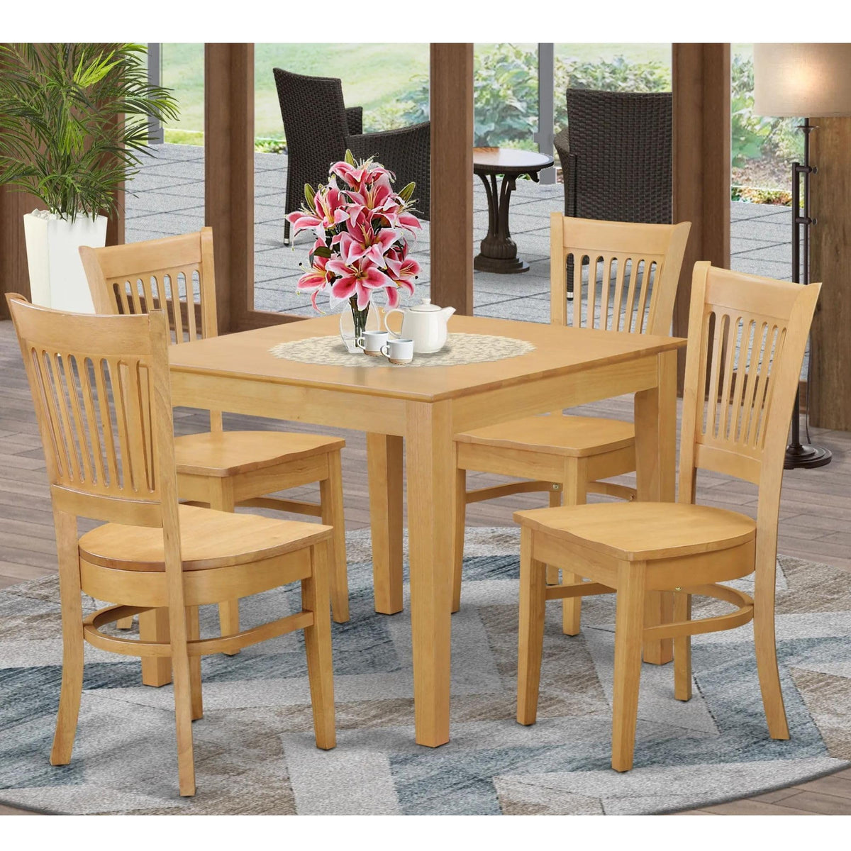 EAST WEST FURNITURE - OXVA5-OAK-W - 5-PIECES KITCHEN TABLE SETRefined 5-Piece Dining Ensemble: Presenting an exquisite 5-piece kitchen table set, showcasing a square dining table accompanied by 4 tastefully designed dining chairs. The kitchen table set boasts a modern and sophisticated design with an impeccably crafted Oak finish gracing its top surface, emanating a sense of timeless elegance. This versatile design seamlessly integrates with a wide spectrum of home decor themes, assuring an enduring aesthetic appeal for the years ahead. This refined dining room set has been meticulously crafted using top-tier Asian Wood, specifically recognized as rubberwood. Renowned for its exceptional durability, strength, unwavering stability, and timeless aesthetic, this choice of wood exemplifies unparalleled quality. The seating material for these kitchen chairs is meticulously crafted from high-quality hardwood, promising an unparalleled and comfortable sitting experience. If you follow the provided instructions, putting together the wooden dining table and kitchen chairs will be a straightforward task. Should you encounter any difficulties, please don't hesitate to reach out to us for assistance. Rest assured, you can purchase our products with confidence, as our main focus is ensuring customer satisfaction!PRODUCT FEATURES: Frame Material: Asian Wood Frame Color: Oak Table Top Style: Square Chair Back Style: Slatted Seat Material: Wood Chair Dimensions: Length: 20; Width: 17; Height: 37. Table Dimensions: Length: 36; Width: 36; Height: 30.Included in the Package: 4 Dining Chairs and a Dining Table.